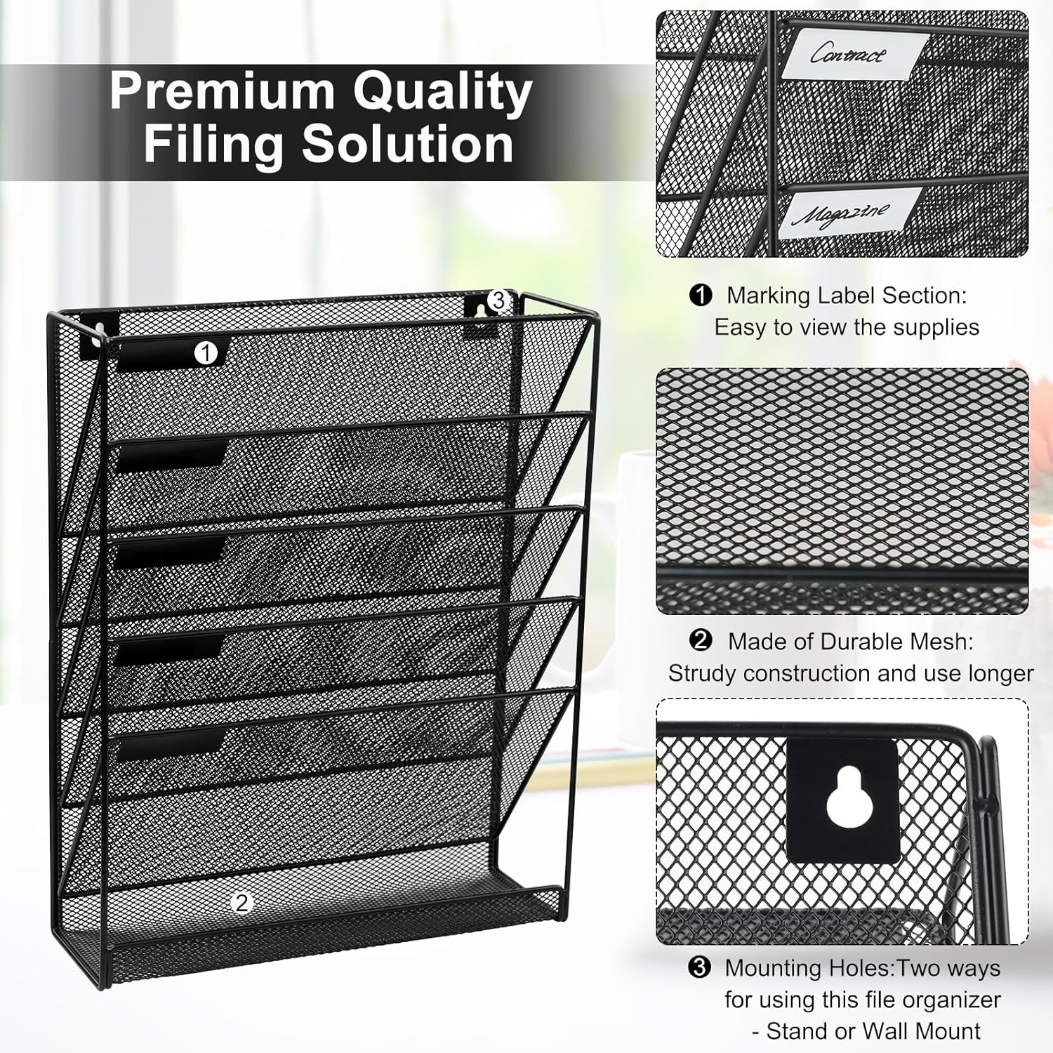 - Multi-Tier Wall Files: This wire mesh file organizer features 5 vertically arranged pockets for letter-sized files, enabling easy storage and organization of a large quantity of files, folders, and documents. A flat tray at the bottom that can hold pens, pencils, scissors, rulers and other accessories