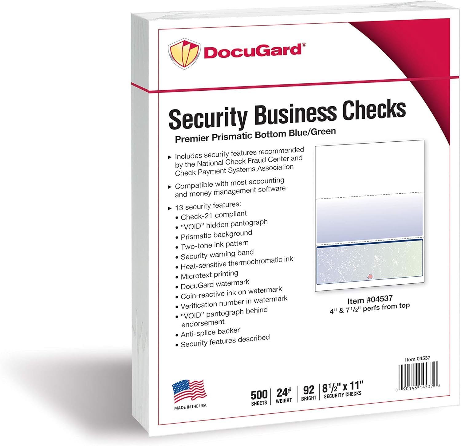 - DocuGard blue/green prismatic bottom business checks utilize 13 comprehensive security features recommended by the National Check Fraud Center and are ANSI compliant