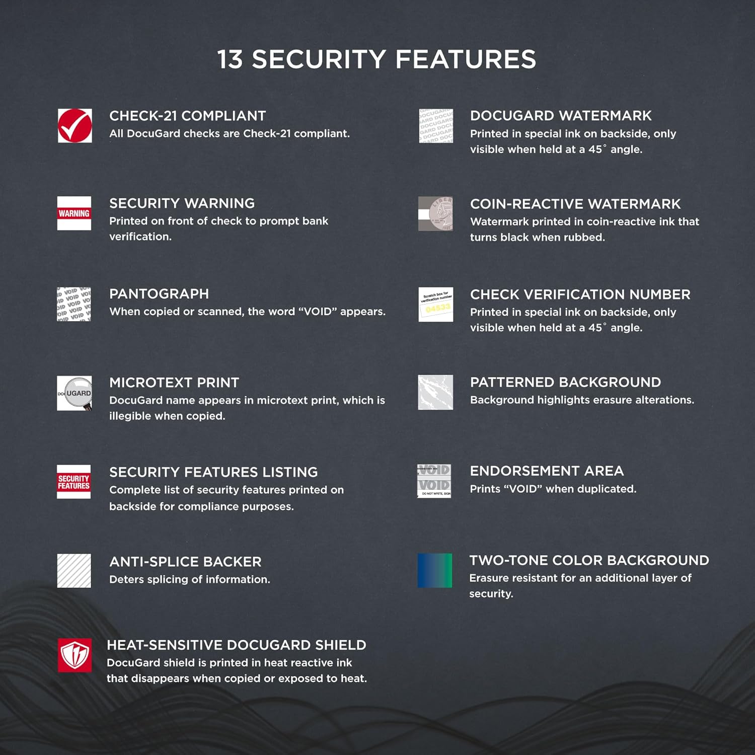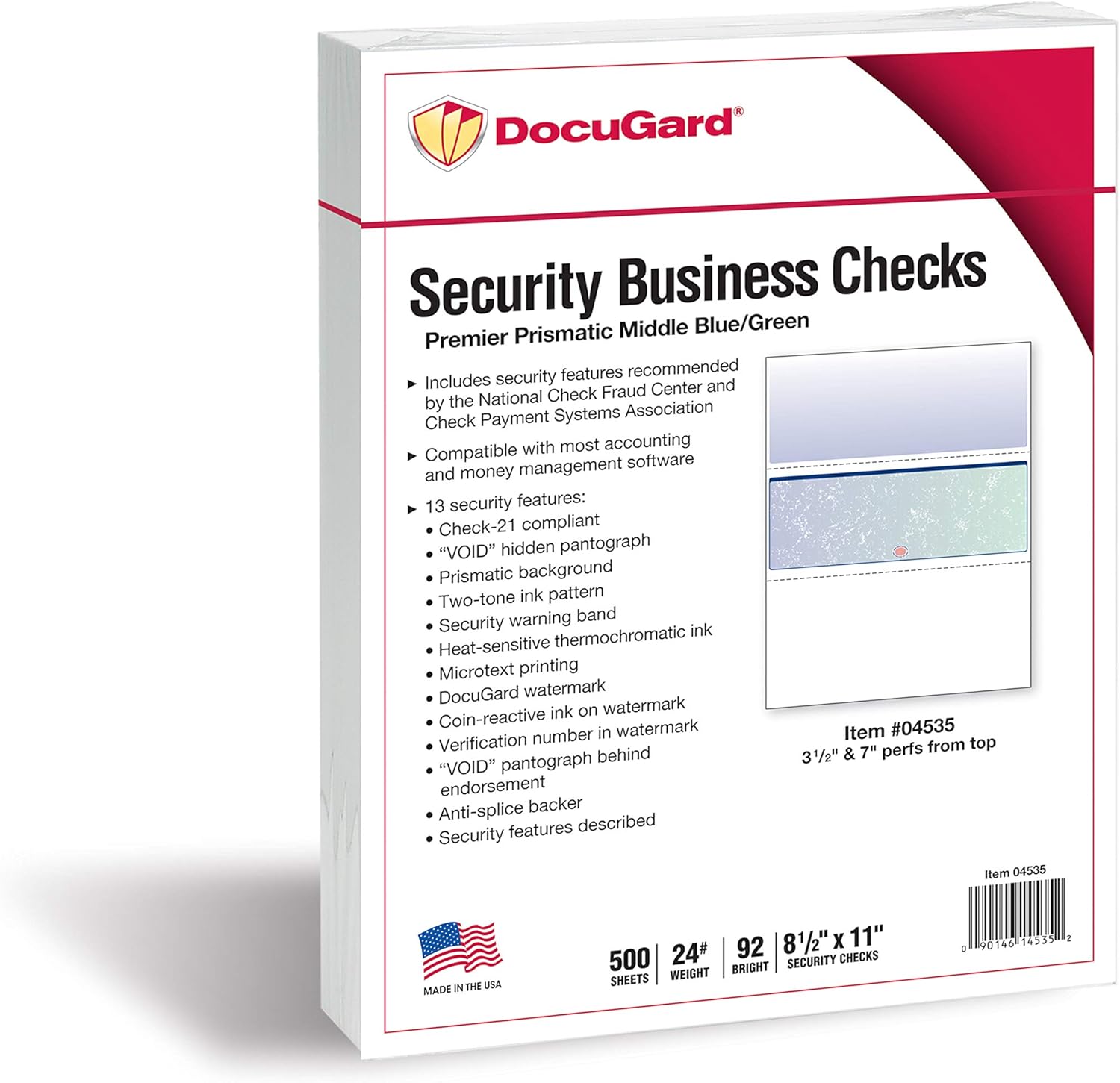- DocuGard blue/green prismatic middle business checks utilize 13 comprehensive security features recommended by the National Check Fraud Center and are ANSI compliant