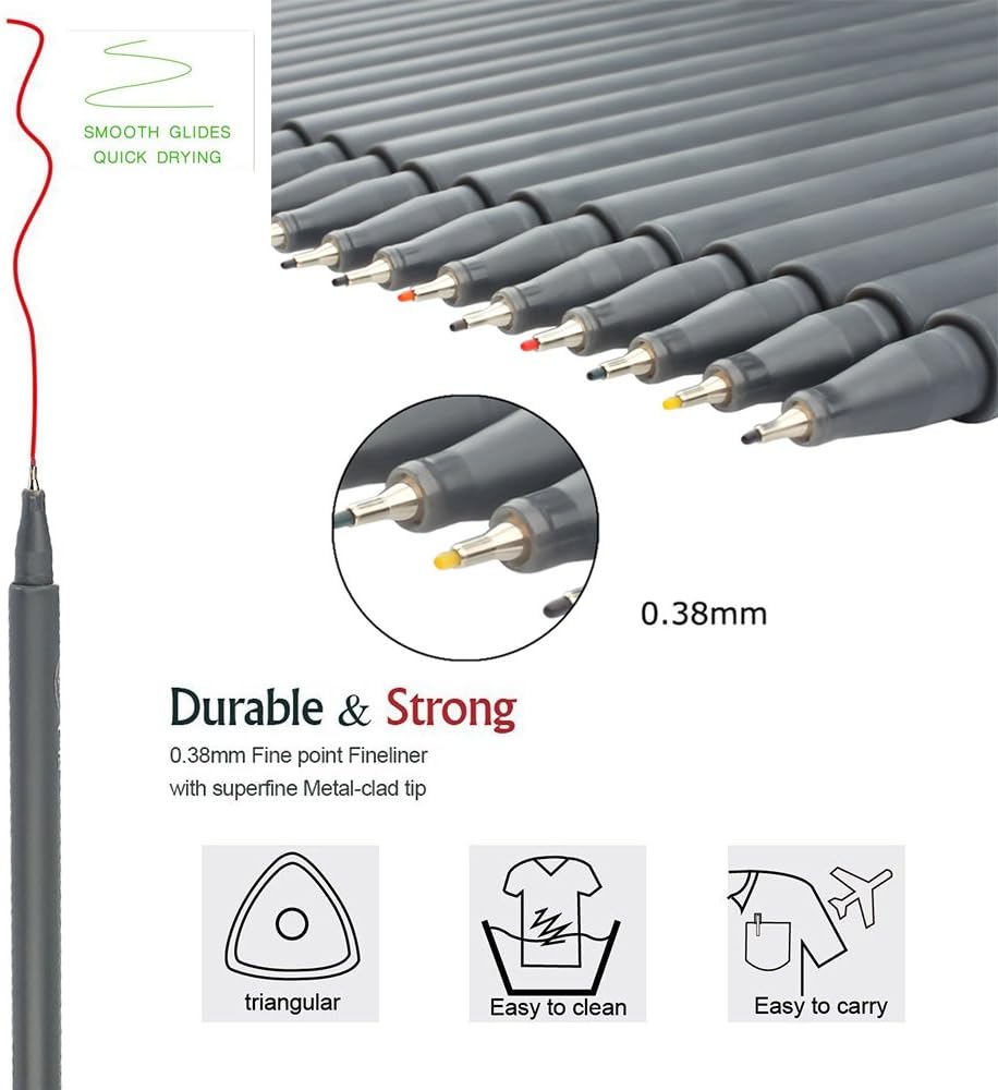 - SMOOTH WRITING: Colorful Fine tip marker pen set with superfine, metal-clad fine tipped and outstanding performance in all areas of writing, drawing, coloring, easy and comfortable to write. Our products are comfortable to use. Especially used by the designers of Architecutre and Animation for drawing lines and signing. Perfect for Journal Pens, Planner Pens, Journaling Pens, Student Pens, School Supplies, Art Supplies, Office Supplies.