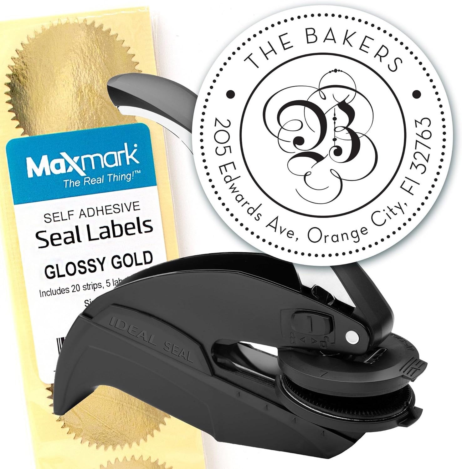 Custom Monogram Address Embosser - Personalized Round Seal with 50 Gold Seal Labels - Style EM024