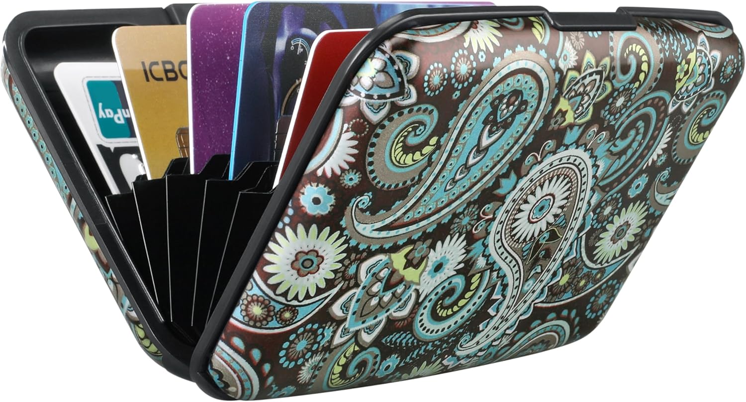 ELFISH Mini RFID Aluminum Wallet Credit Cards Holder Business Card Case Metal ID Case for Men Women (Blue flower)