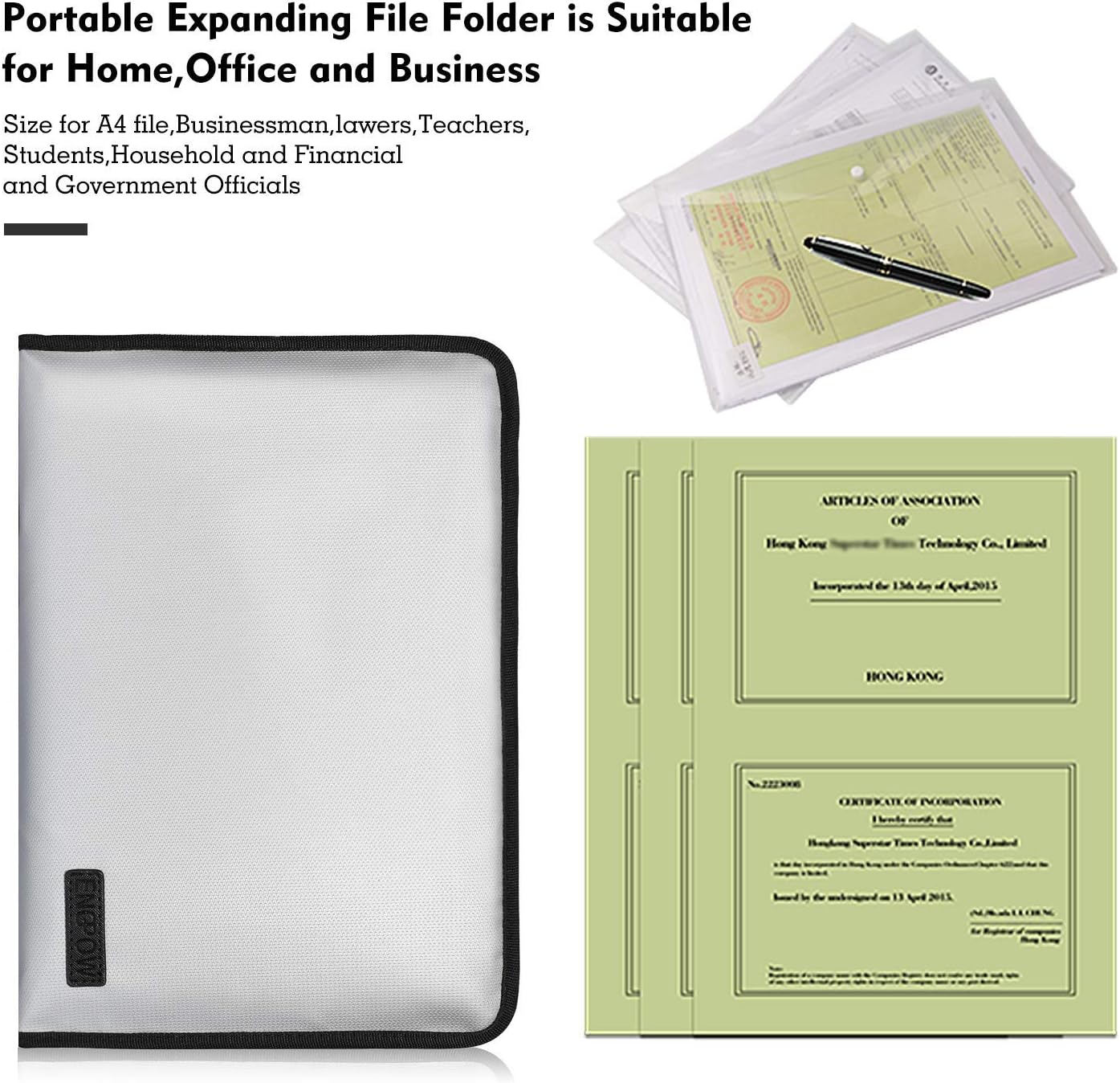 - Original Intention: Accidents happen when we least expect, and there’s nothing more devastating than a fire that takes away valuable paperwork, personal information, pictures or achievements.That’s why we developed the fireproof document bag- Protect your financials, personal information,document notebook, that won’t let you down when emergency strikes.