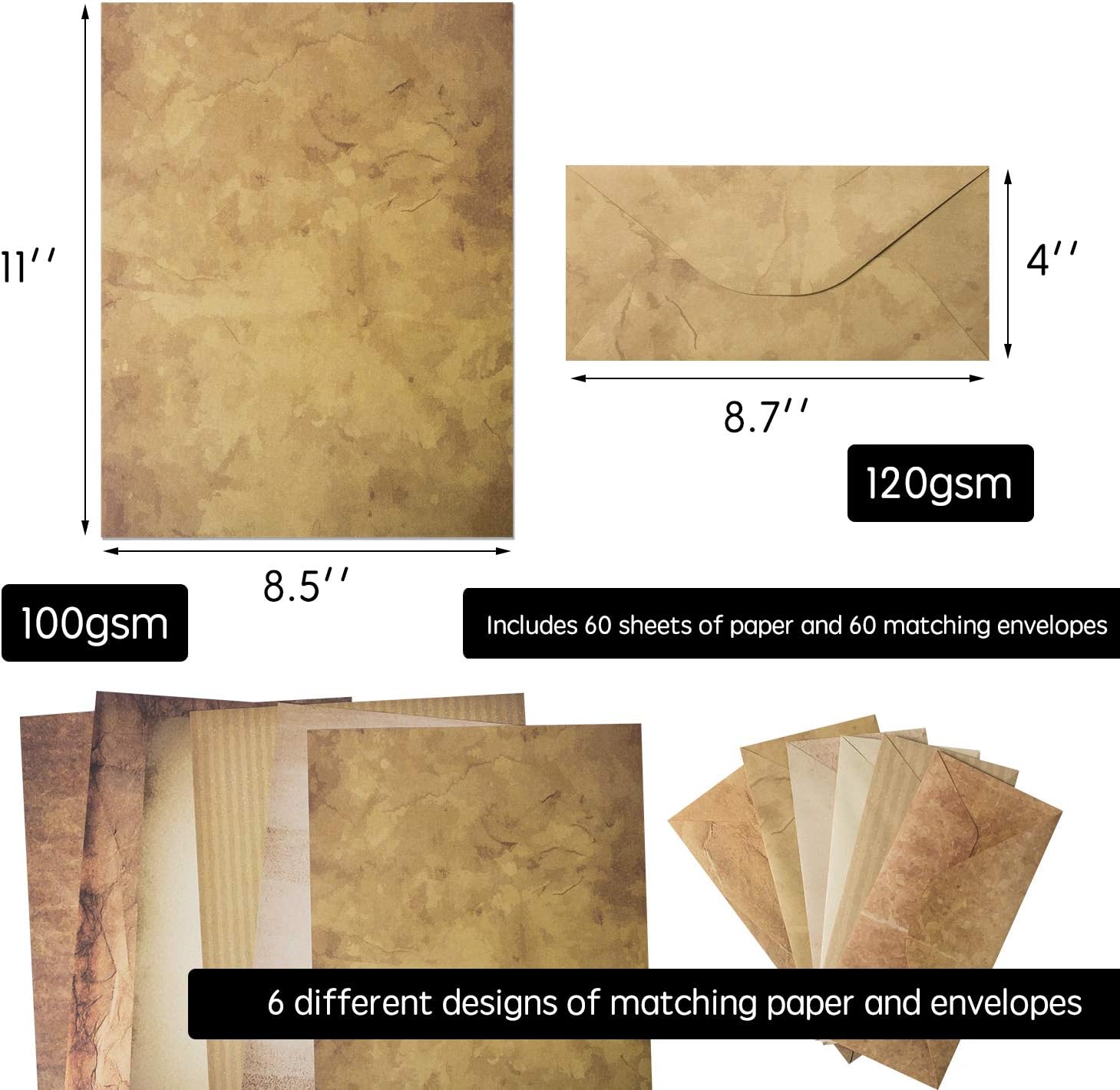 - EYE CATCHING AGED LOOK: 60 Classic vintage antique design stationery papers with 60 antique looking envelopes, comes in six different unique looks. DIMENSIONS: Paper measures 8.5 x 11 inches, Envelopes measure 4 x 8.7 inches