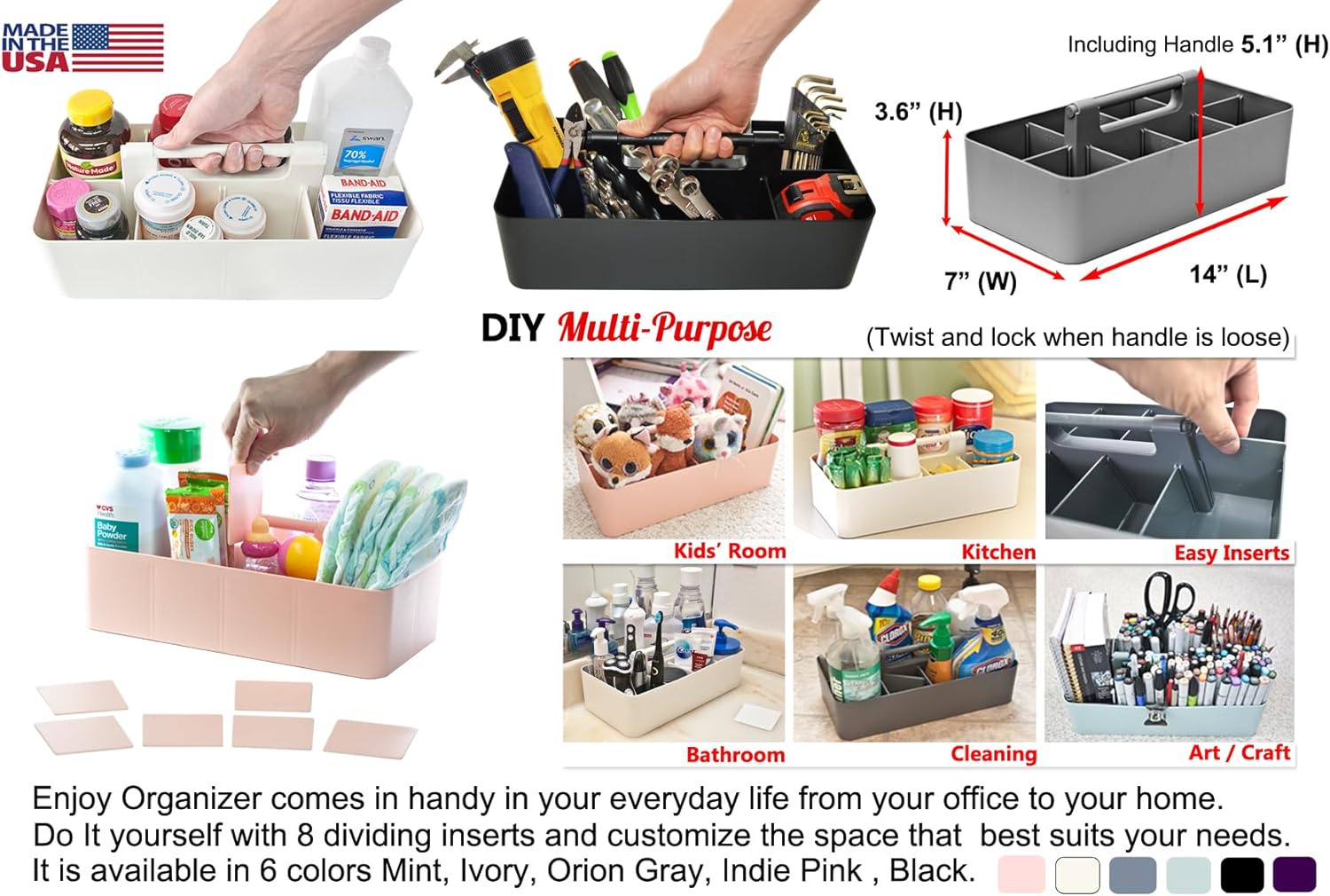 -Large Portable Caddy, DIY Dividers, 8 Compartments, Office Supplies Organizer, Simple, Portable Basket with Handle Storage Organizer Modern,Endless Multi Use -Made in USA