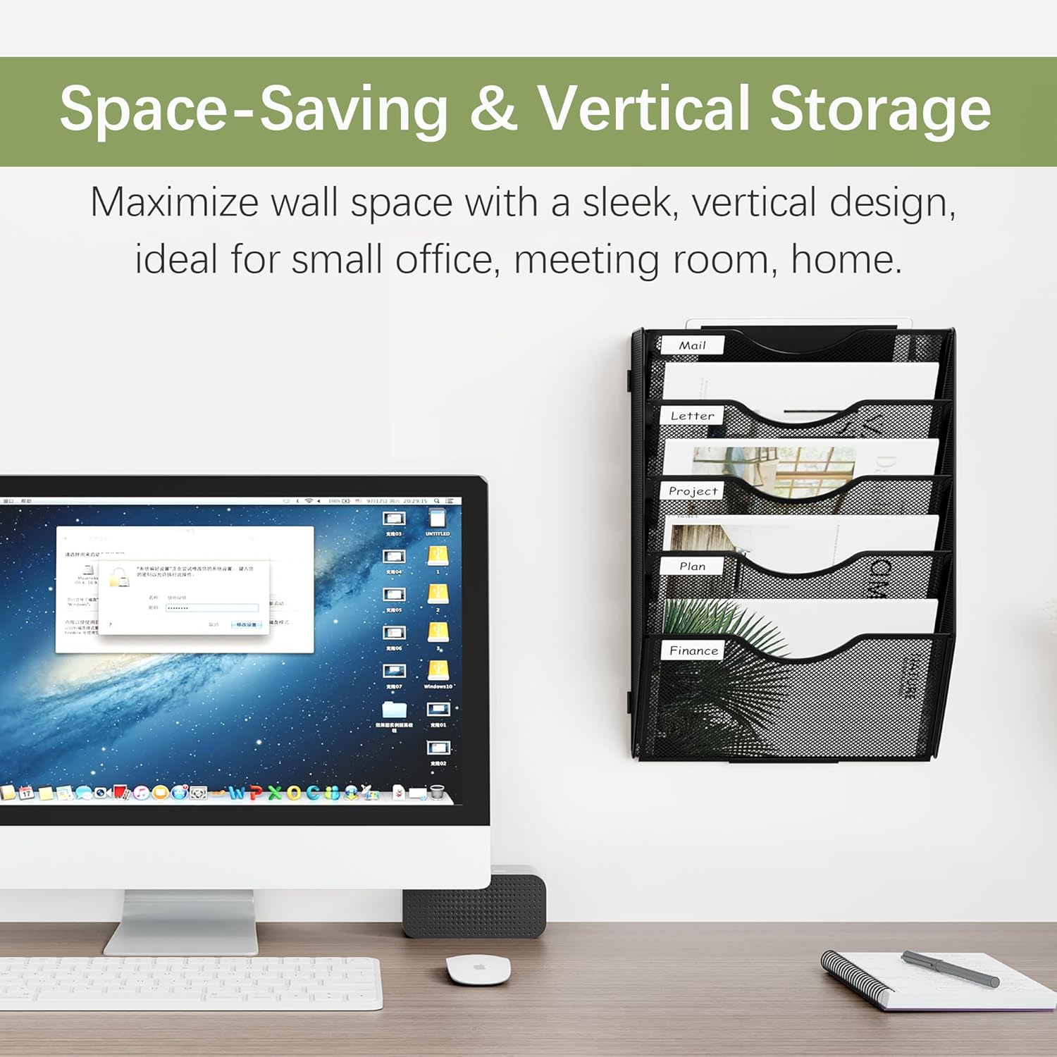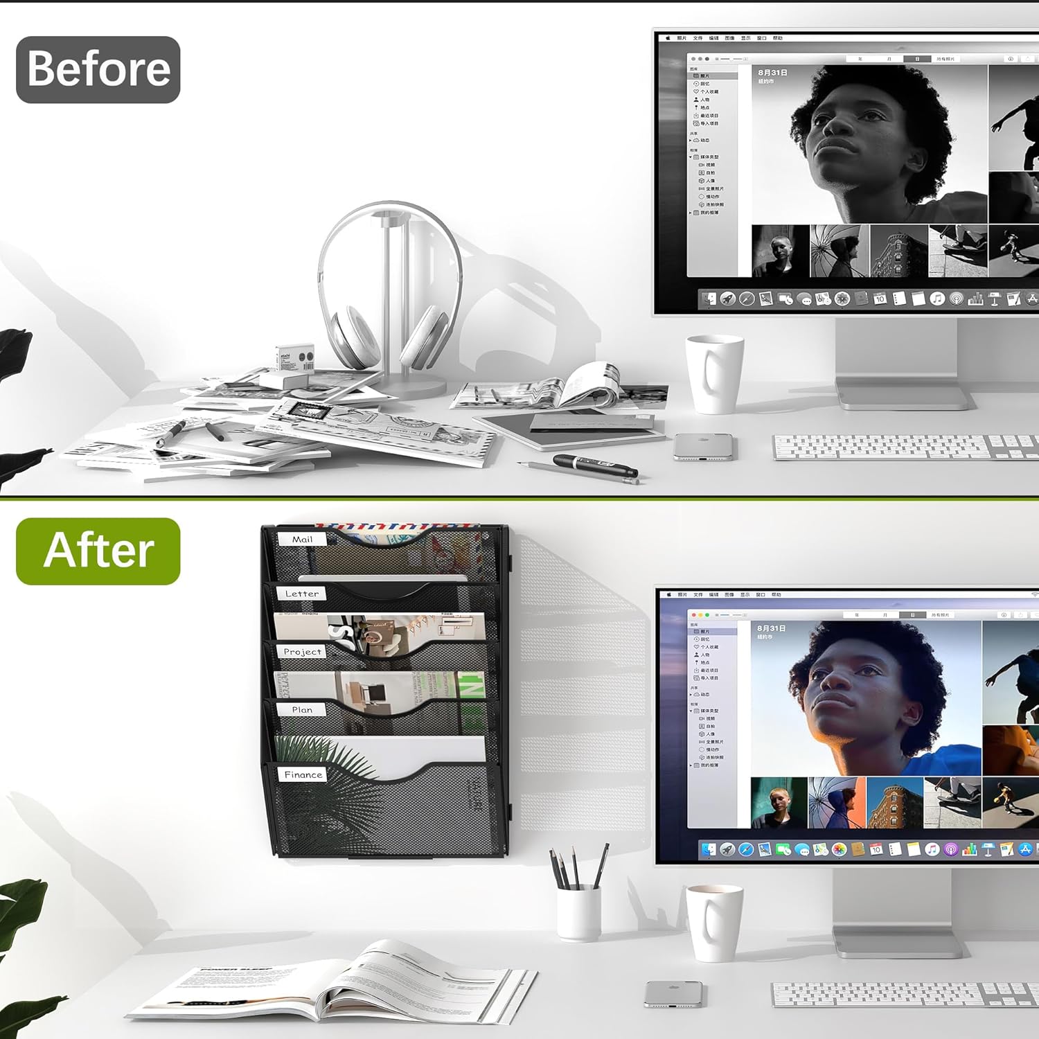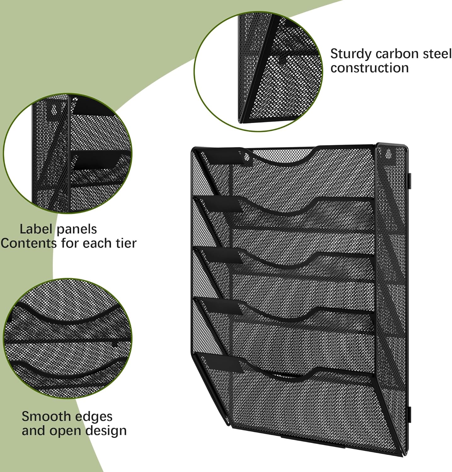 - Space Saving: 5 tier metal wall file organizer comes with mounting screws that can be easily mounted on the wall. Use your home or office space more efficiently by keeping your files organized and off the desk and workspace.