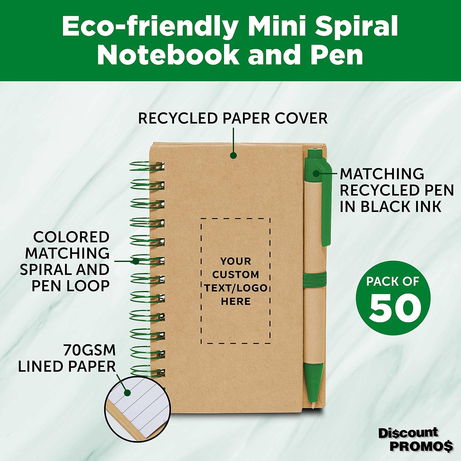Custom Mini Spiral Notebooks with Black Ink Pens Set of 50, Personalized Bulk Pack - Perfect for School, Office, Business, Home - Green