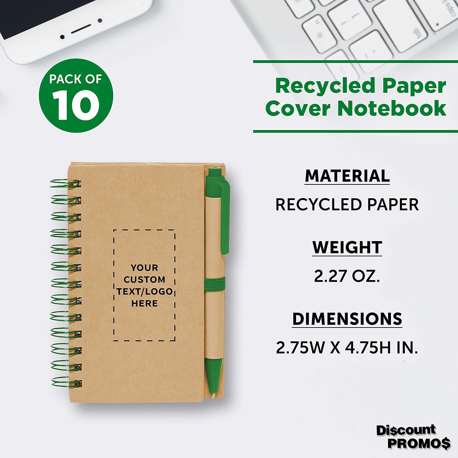 Custom Mini Spiral Notebooks with Black Ink Pens Set of 10, Personalized Bulk Pack - Perfect for School, Office, Business, Home - Green