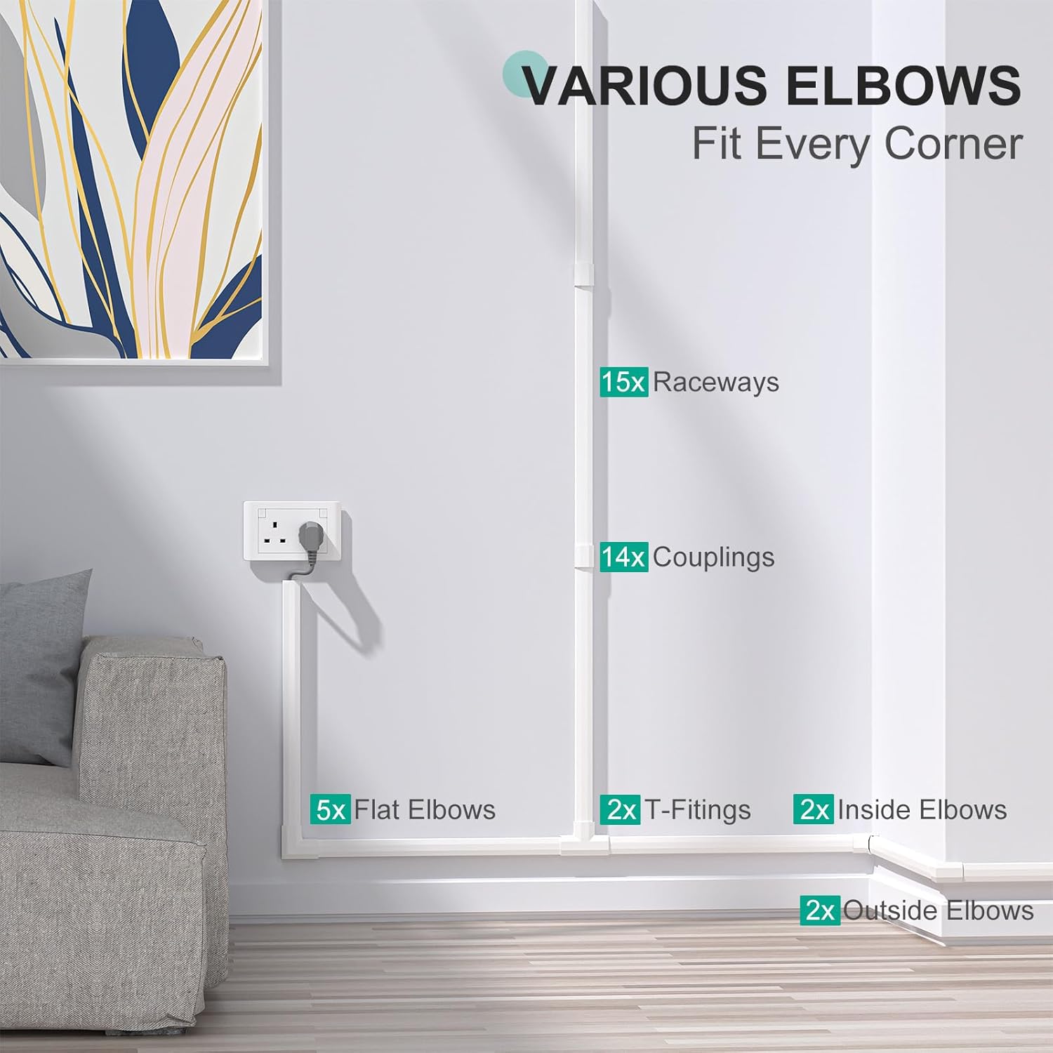 - 15 Pcs White Cord Hider Kit: Our cable hider kit includes 15Ă—plastic cable raceways channels (each channel is L16.9inĂ—W1.18inĂ—H0.6in, 254 inches total in length), 14Ă—Couplings, 5Ă—Flat Elbows, 2Ă—T-connectors, 2Ă— Inside Elbows, 2Ă— Outside Elbows, 32Ă—screws, 32Ă—wall anchors, 2Ă—rolls of double-sided tape and an installation guide, 254" wire covers for cords on wall enough for just about any job