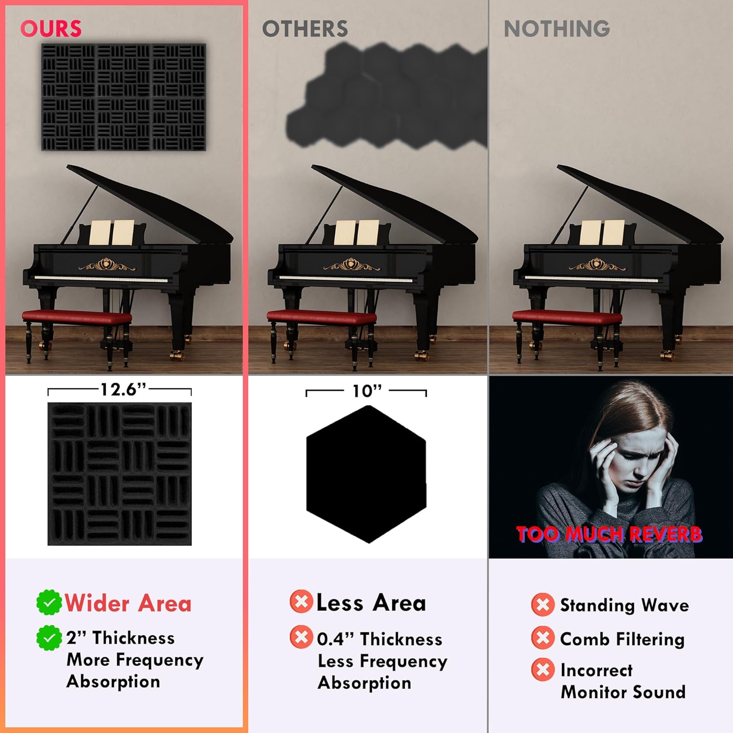 - Harmonious design - Our sound dampening panels is 2" thick and 12.6"x12.6" size and made with polyurethane foam to make your workspace or gaming room look even more professional with non-monotonic pattern design as well as high-frequency control and insulation