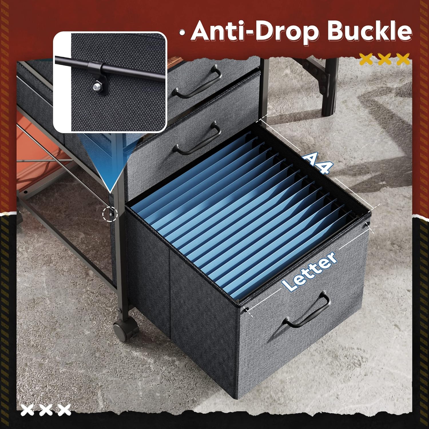 - Easy to Move: Rolling on 4 wheels, this mobile file cabinet can fix or move around your home office freely. Built-in brakes on front 2 casters to keep it in position and add stability. Unique fabric drawer design makes it only weigh 22 lbs. and light to move.