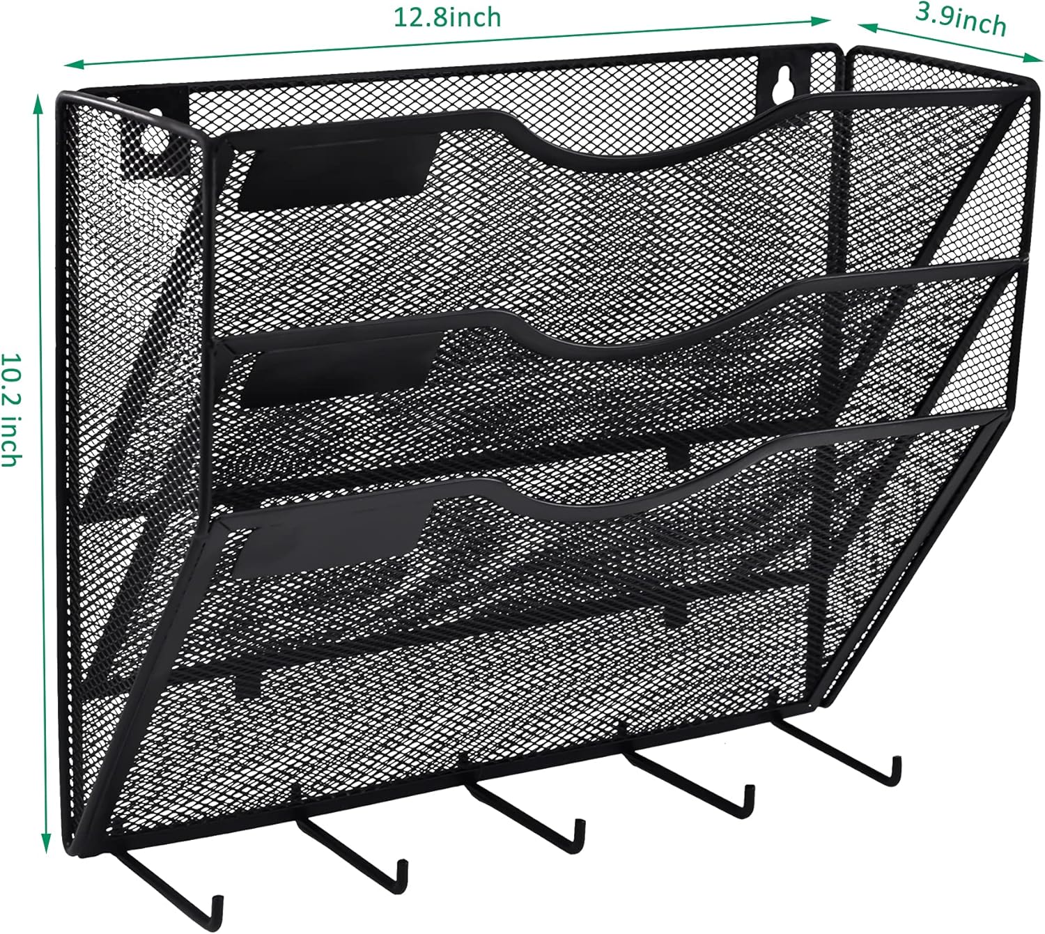 EASEPRES 3 Pocket Mesh Hanging File Organizer with Key Holder Hooks & Nametag Label, Wall Mounted Mail Paper Document Folder Clipboard Storage Organization Magazine Rack for Office Cubicle, Black