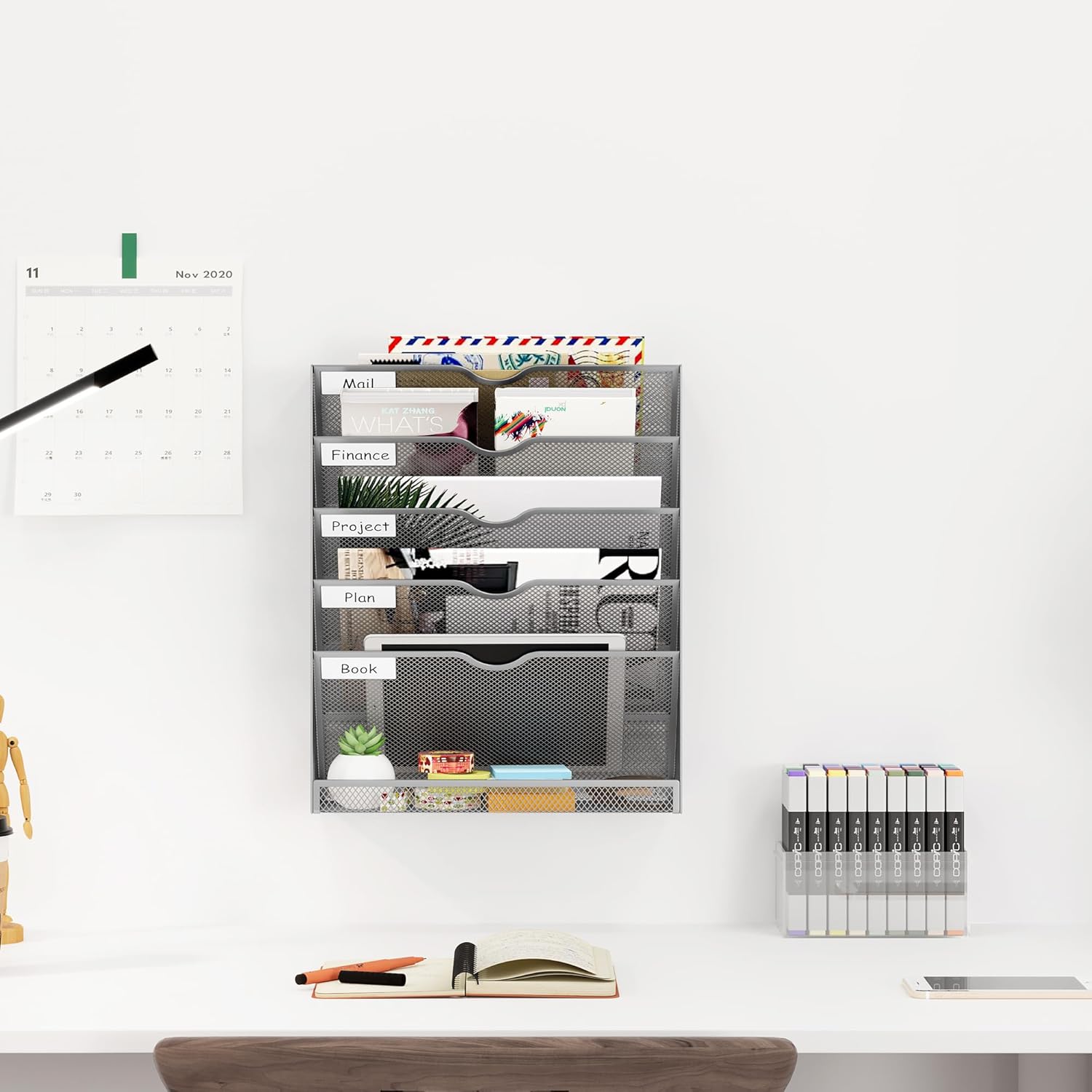 EasyPAG 5-Tier Wall File Holder, Mesh Hanging Folder Organizer with Classify Label, Versatile Desk File Organizer for Office Home, Vertical Wall Mounted Mail Sorter, Sides Closed, Silver