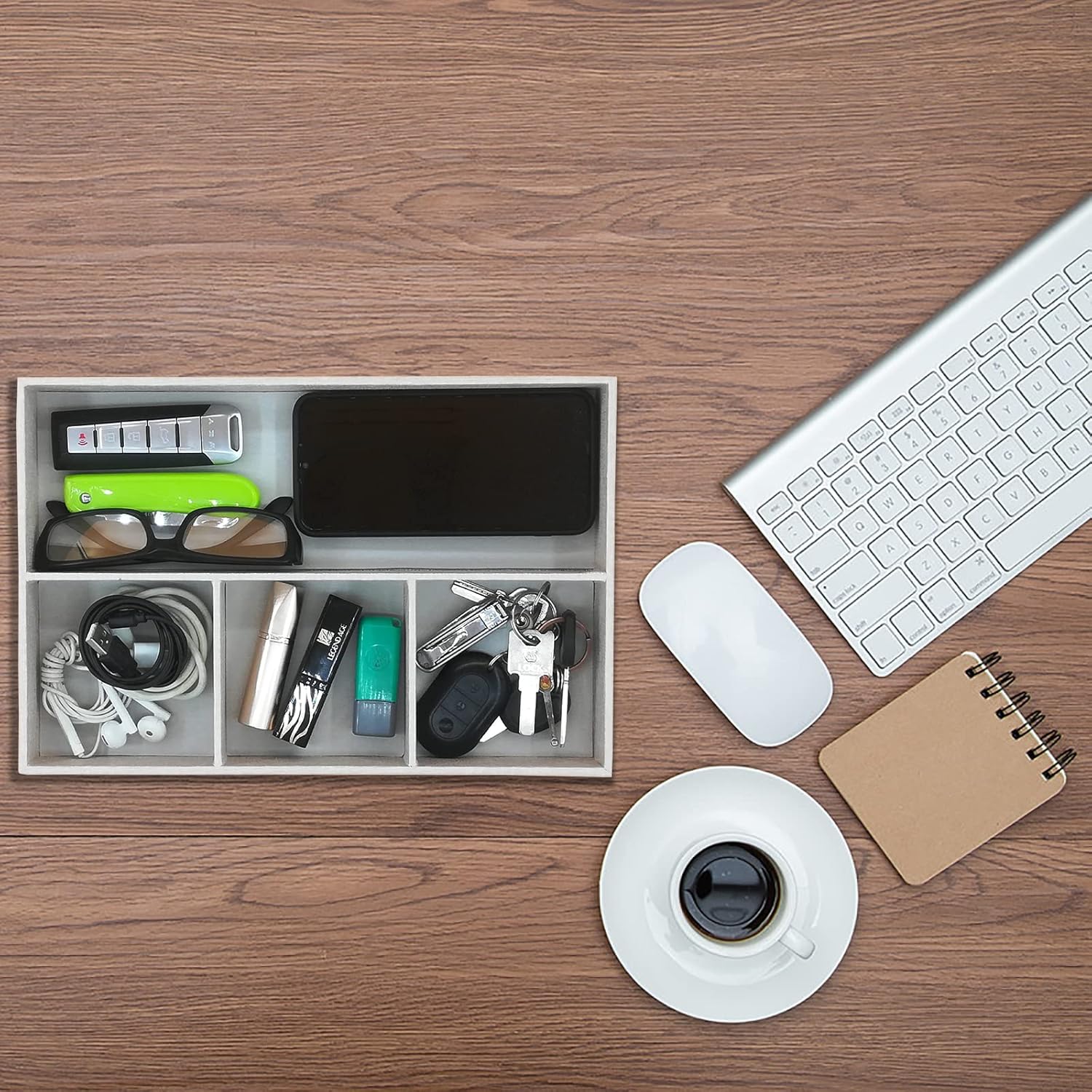- [Perfect design] 4 compartments, better classification and protection of accessories. The right size will not take up your extra space. Therefore, you donβt need to waste a lot of time searching for misplaced items. Make your space more tidy and orderly. The perfect daily tray, suitable for your desk, bedside table, dressing table, entrance hall, side table, etc.