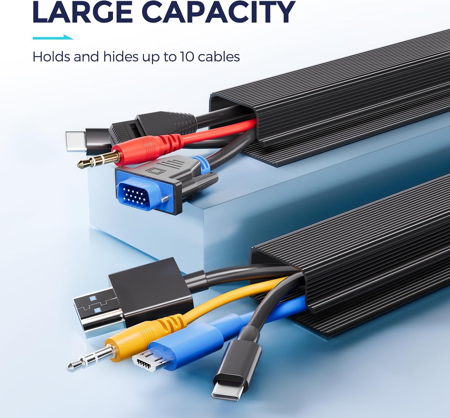 - 【Versatile Installation Options】Whether it’s managing cables under a desk, concealing wires in a corner, or storing cords on a desktop, this cord management can easily meet your needs. Note that adhesive tape of the cable raceway might not stick as well on powdery or uneven surfaces; for best bonding results, install the desk cable management and wait 24 hours before placing wires