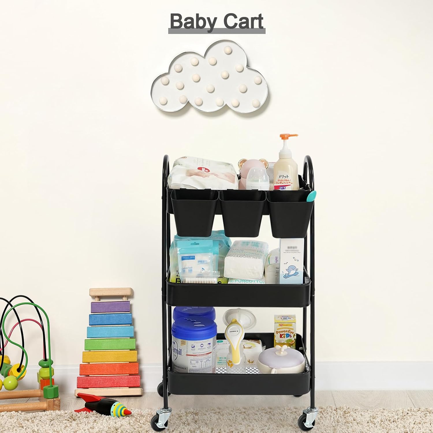 danpinera 3-Tier Rolling Cart, Metal Rolling Storage Cart with Lockable Wheels & Hanging Cups & Hooks, Mobile Trolley Cart for Kitchen, Bathroom, Office, Workshop, Black