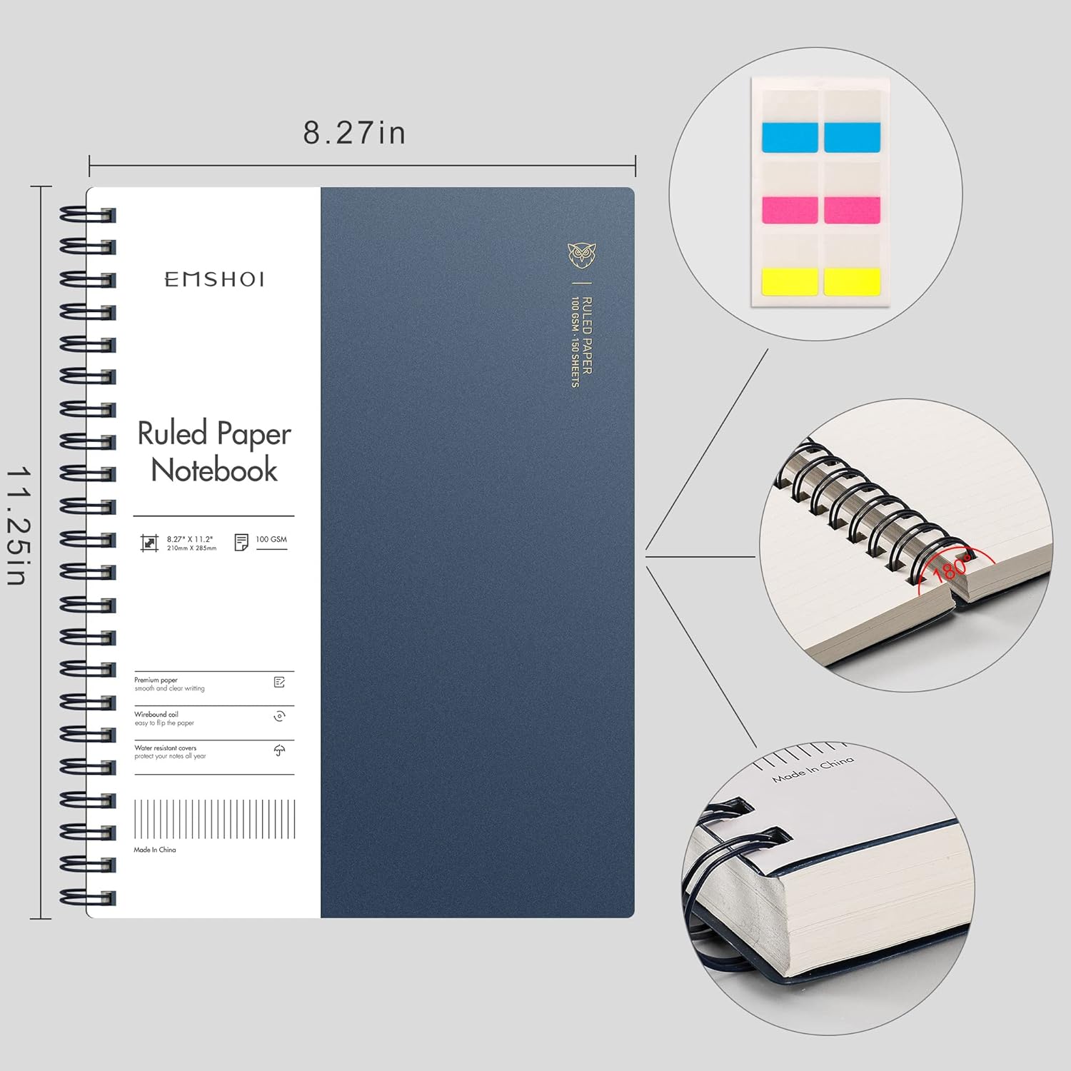 EMSHOI A4 Spiral Notebook College Ruled Lined Journal, 11.2" X 8.27", 300 Pages/150 Sheets, 100gsm Thick Paper, Waterproof Softcover, Twin-Wire Binding, for School Work Business Writing-Blue