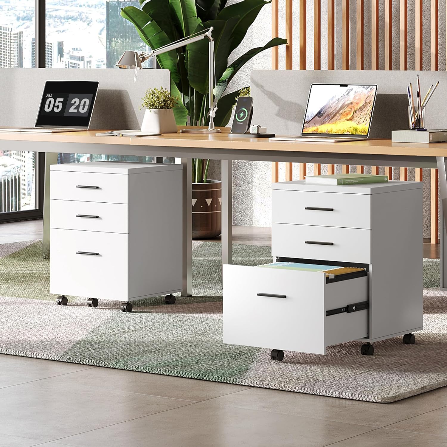 - DURABLE CASTERS: 5 rolling casters which can move smoothly on both wooden floor and carpet. With front 2 lockable braking wheels, makes office supply rested on top, like printer. Middle casters prevent tipping over when all drawers open at the same time.