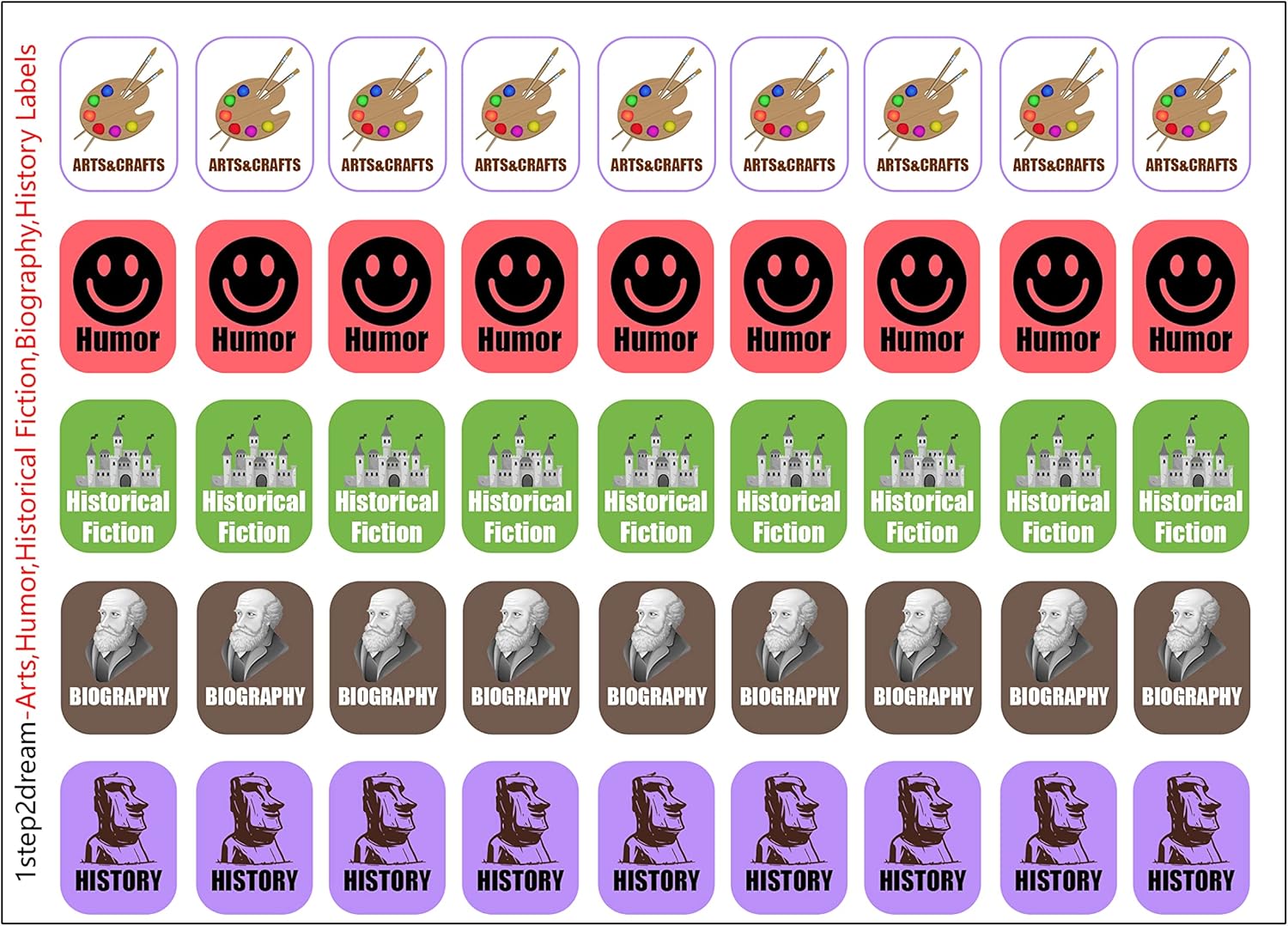 - Organize special collections or communicate information to library patrons with these classification labels.Includes:90pcs Arts,90pcs Humor,90pcs Historical Fiction,90pcs Biography,90pcs History.