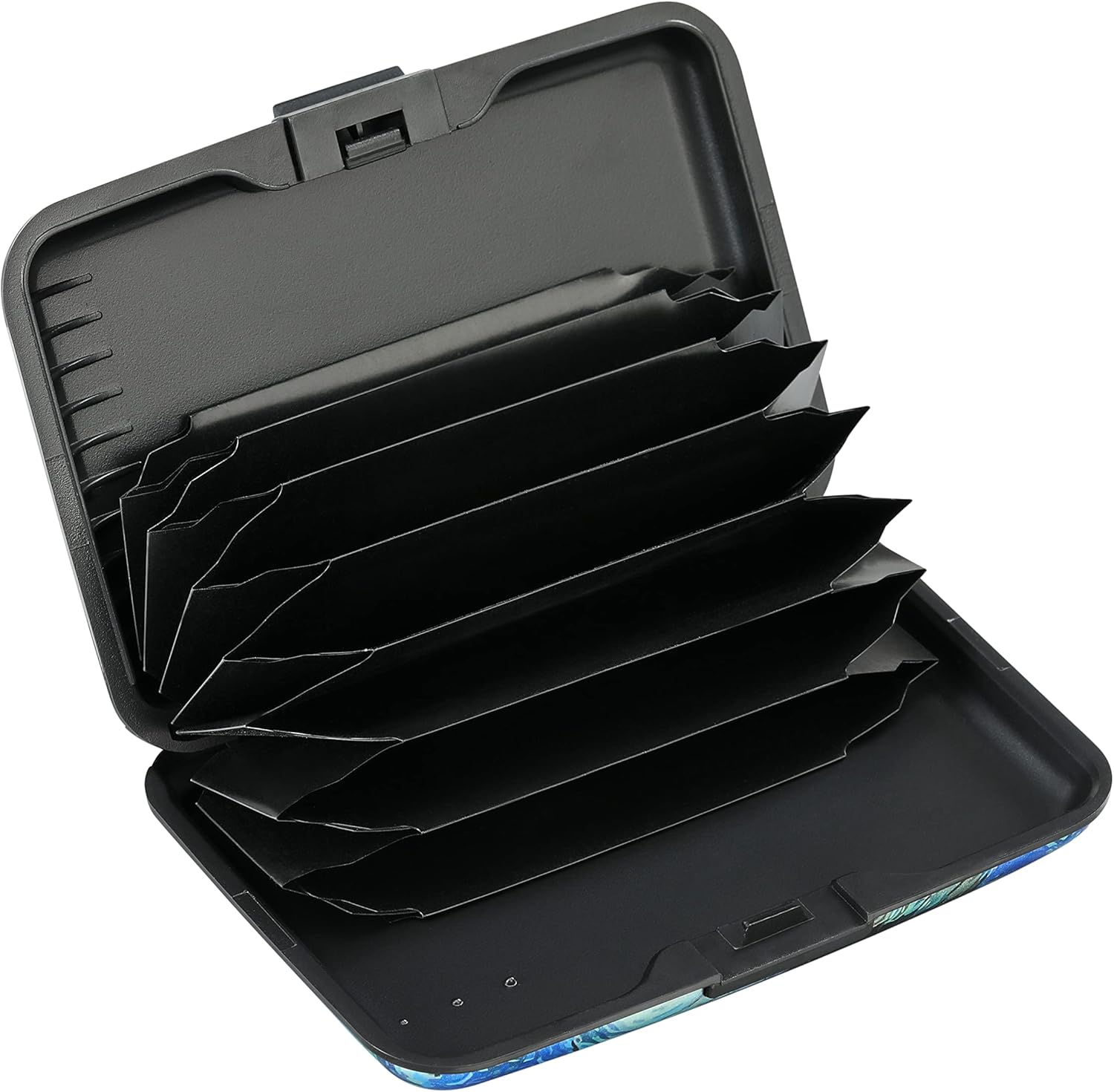 - This credit card holder is made of aluminum shells, ABS plastic frame and clasp closure, RFID-blocking will protect your card data from RFID scanners and readers.