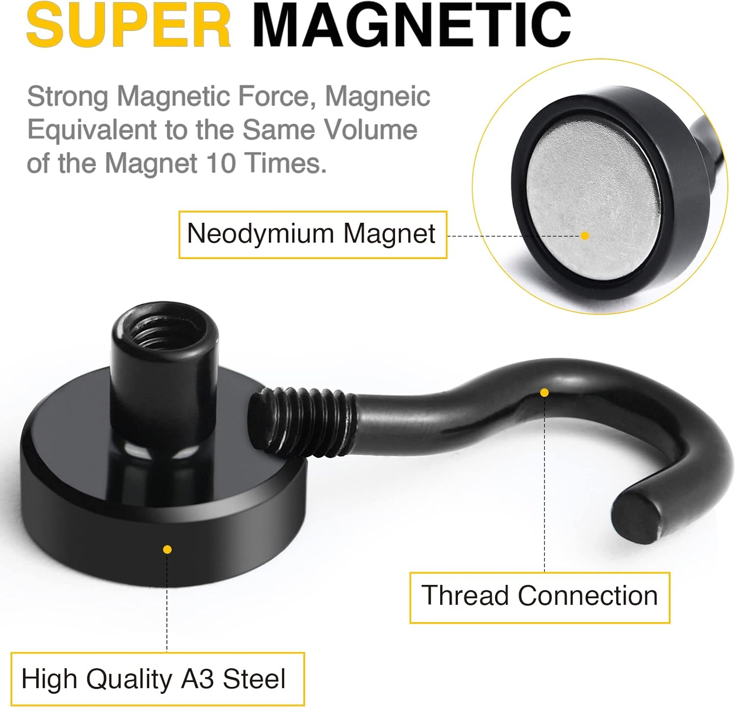 - 【Excellent Black layer Coating】Strong rare earth neodymium magnet hooks are plated with 3 layers of protective coatings - Nickel + Copper + Nickel (Ni-Cu-Ni), which can greatly resist rust and corrosion, making magnetic hooks ideal for long term use.