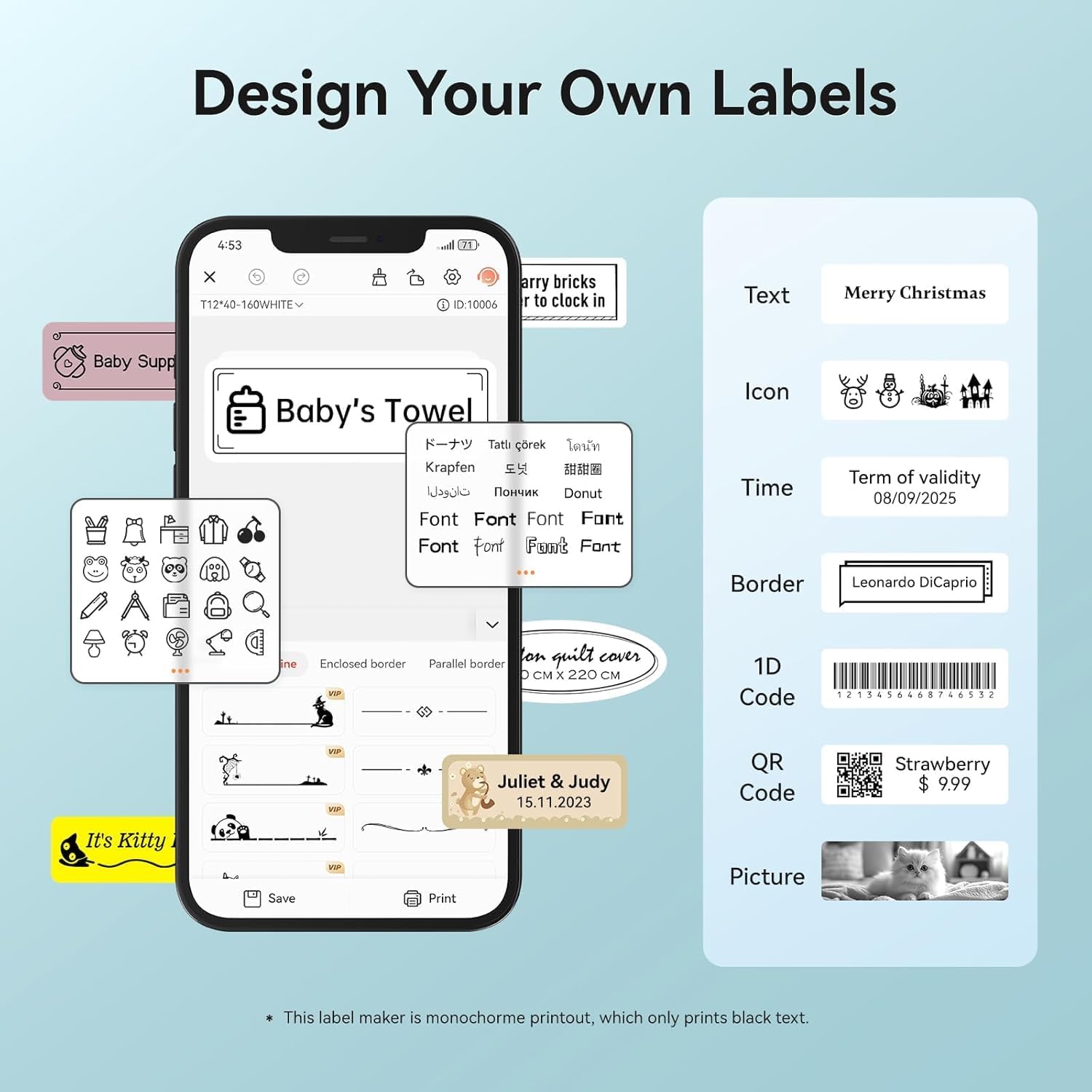 - 【Free APP & Multiple Templates】Our Portable label maker uses exclusive mobile APP to edit, which provides a variety of free templates, allows you to import label text from Excel files, supports printing various texts, numbers, graphics, symbols, logos, barcodes, QR codes Label, etc, provides with smooth printing effects and fast processing.