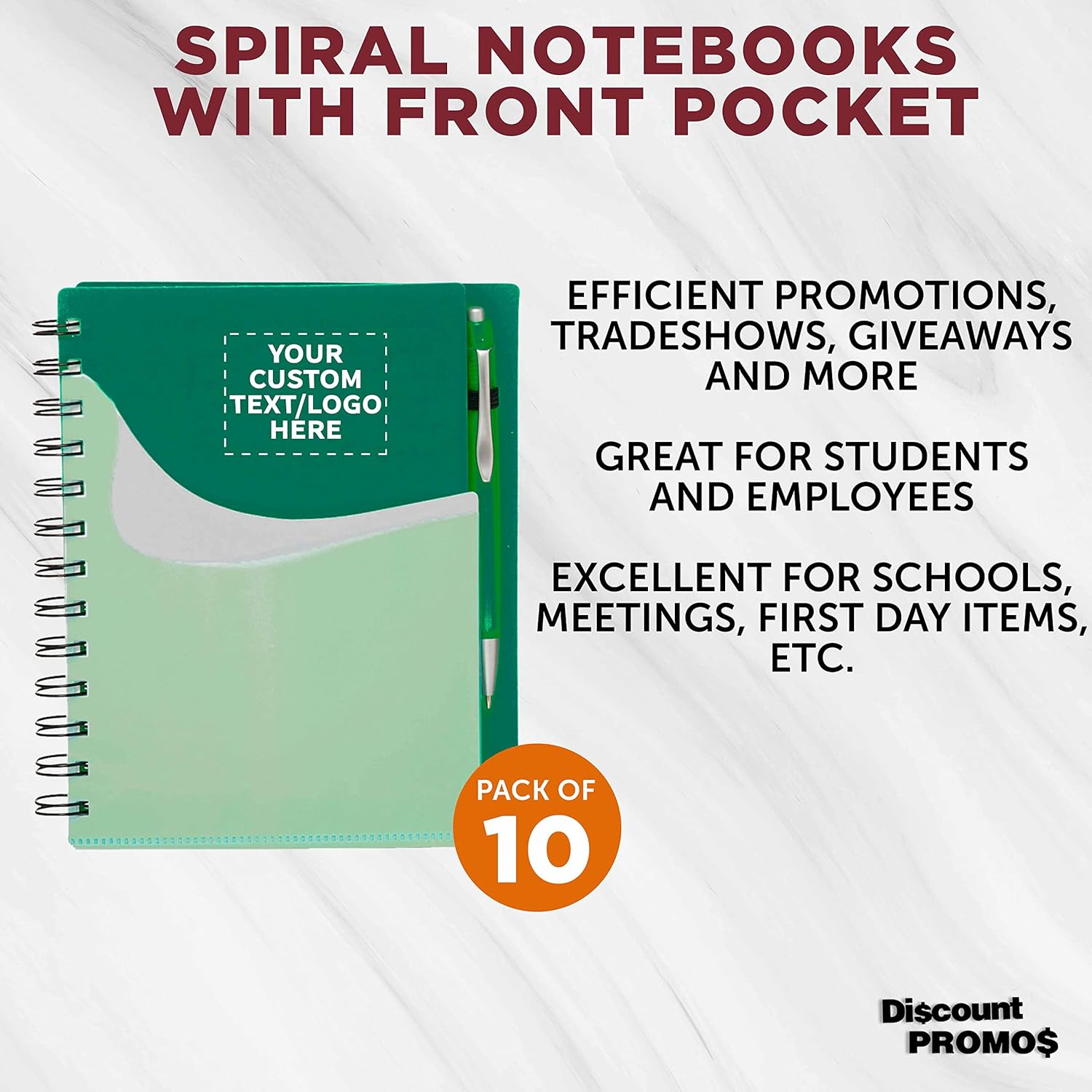 DISCOUNT PROMOS Custom Spiral Notebooks with Front Pocket Set of 10, Personalized Bulk Pack - Durable Plastic Cover, Includes Matching Pen in Blank Ink, Perfect for School, Office, Home - Green