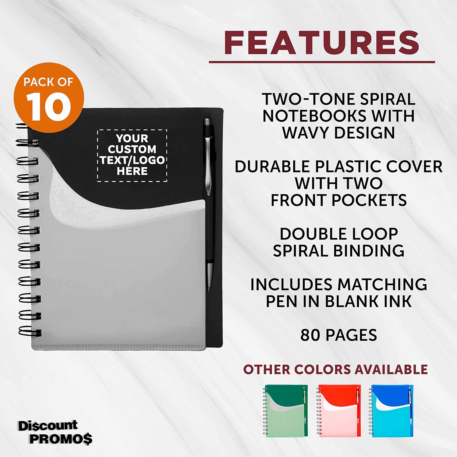 DISCOUNT PROMOS Custom Spiral Notebooks with Front Pocket Set of 10, Personalized Bulk Pack - Durable Plastic Cover, Includes Matching Pen in Blank Ink, Perfect for School, Office, Home - Black
