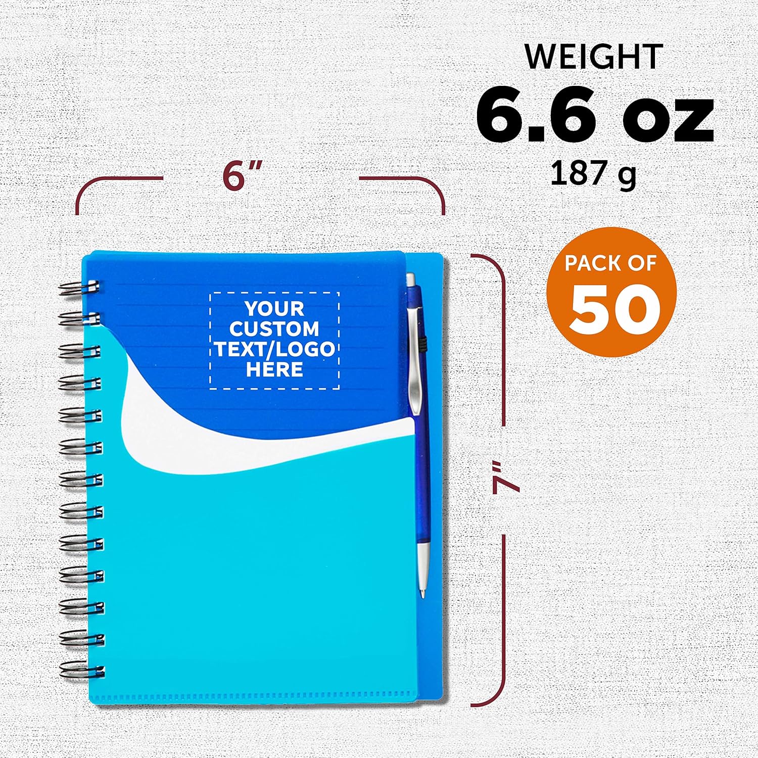 DISCOUNT PROMOS Custom Spiral Notebooks with Front Pocket Set of 50, Personalized Bulk Pack - Durable Plastic Cover, Includes Matching Pen in Blank Ink, Perfect for School, Office, Home - Blue