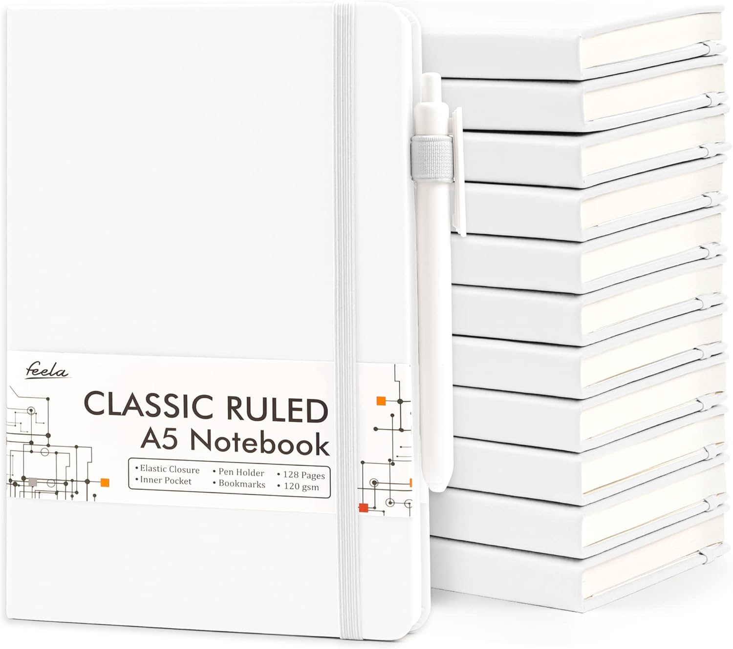 feela 12 Pack Notebooks Journals Bulk, Hardcover Notebook Classic Ruled Lined Journals with Pen Holder for Women Girls School Business Supplies, with 12 Black Pens, 120 GSM, 5.1”x8.3”, A5, White