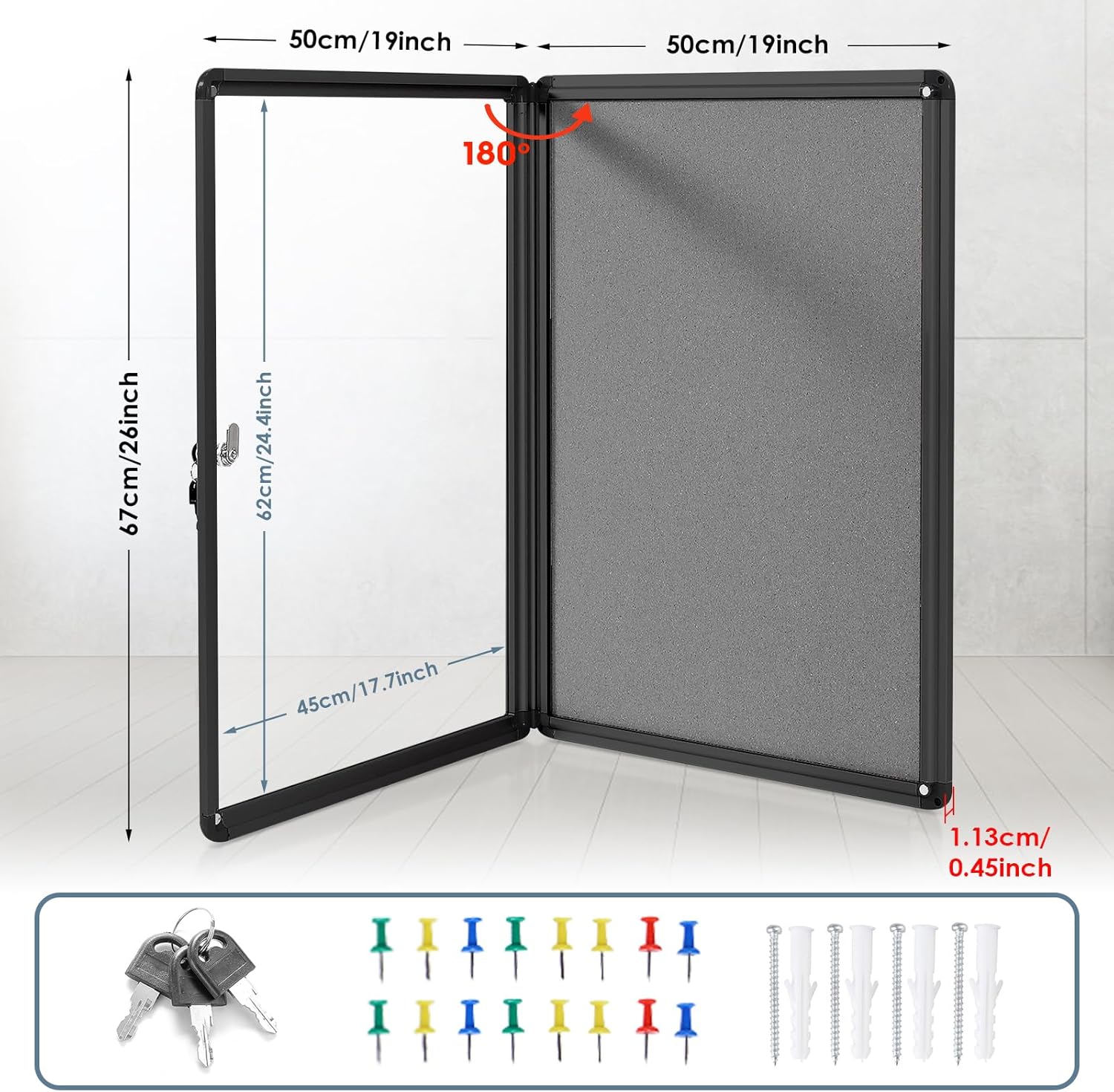 • HIGH-QUALITY MATERIAL:It is made of grey felt pin board, durable aluminum construction, shatter-resistant acrylic door and ABS rounded corners