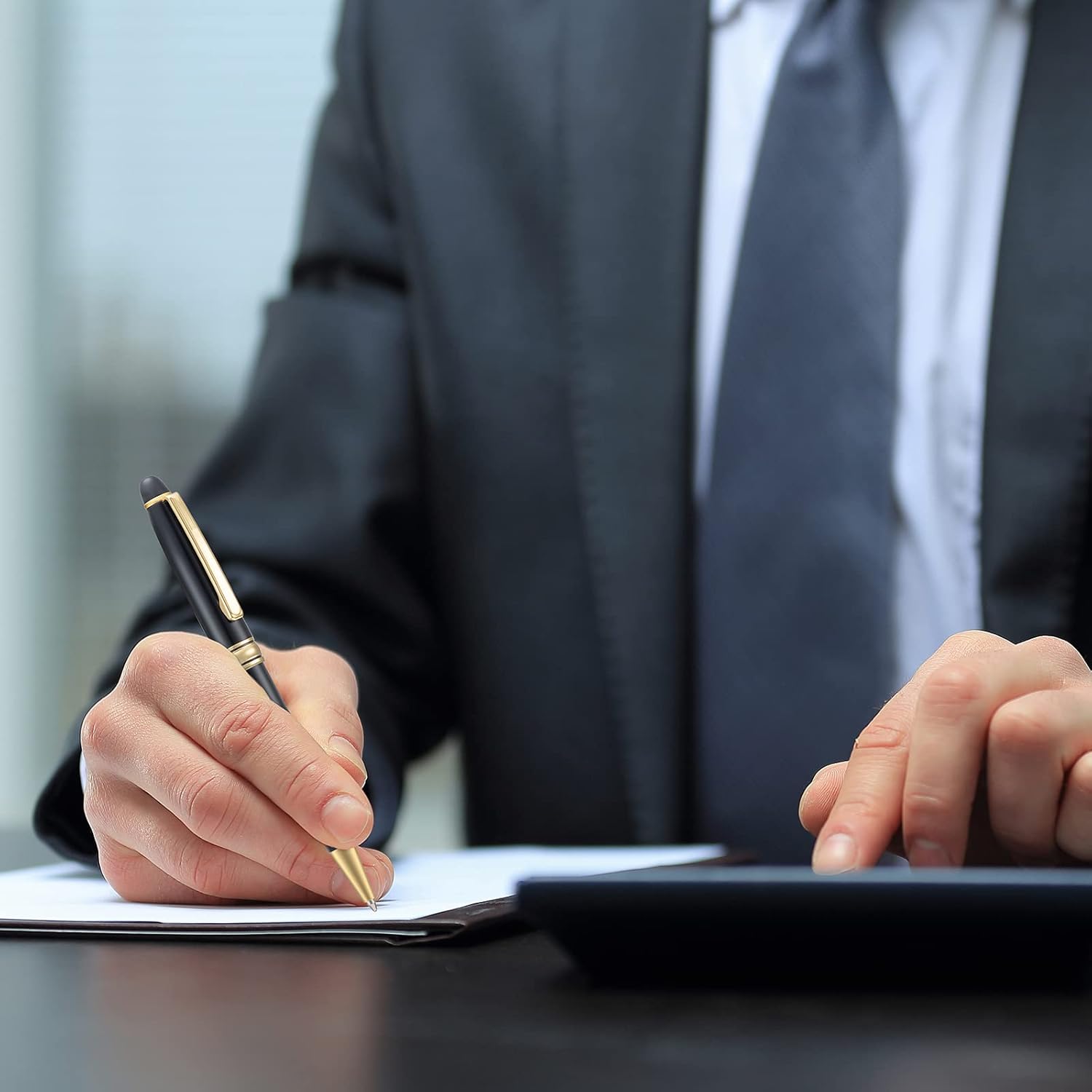 5 PCS Black Ballpoint Pens with Extra Refills Set, 1mm Medium Point Black Ink, Great Smooth Writing Metal Pen for Business Office Teacher Student Wedding Guest Gift (Gold Trim)