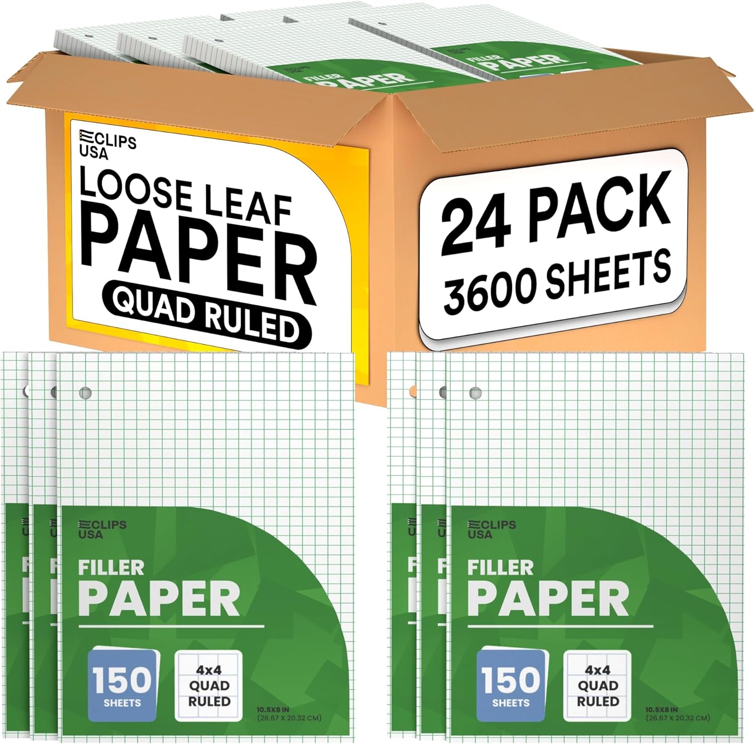 Graph Paper, Loose Leaf Graph Paper, 4 x 4 An Inch Quad Ruled Graph Paper, 10.5” x 8” Graphing Paper, 56 gsm, 150 Per Pack, 3600 Sheets (24 Pack)