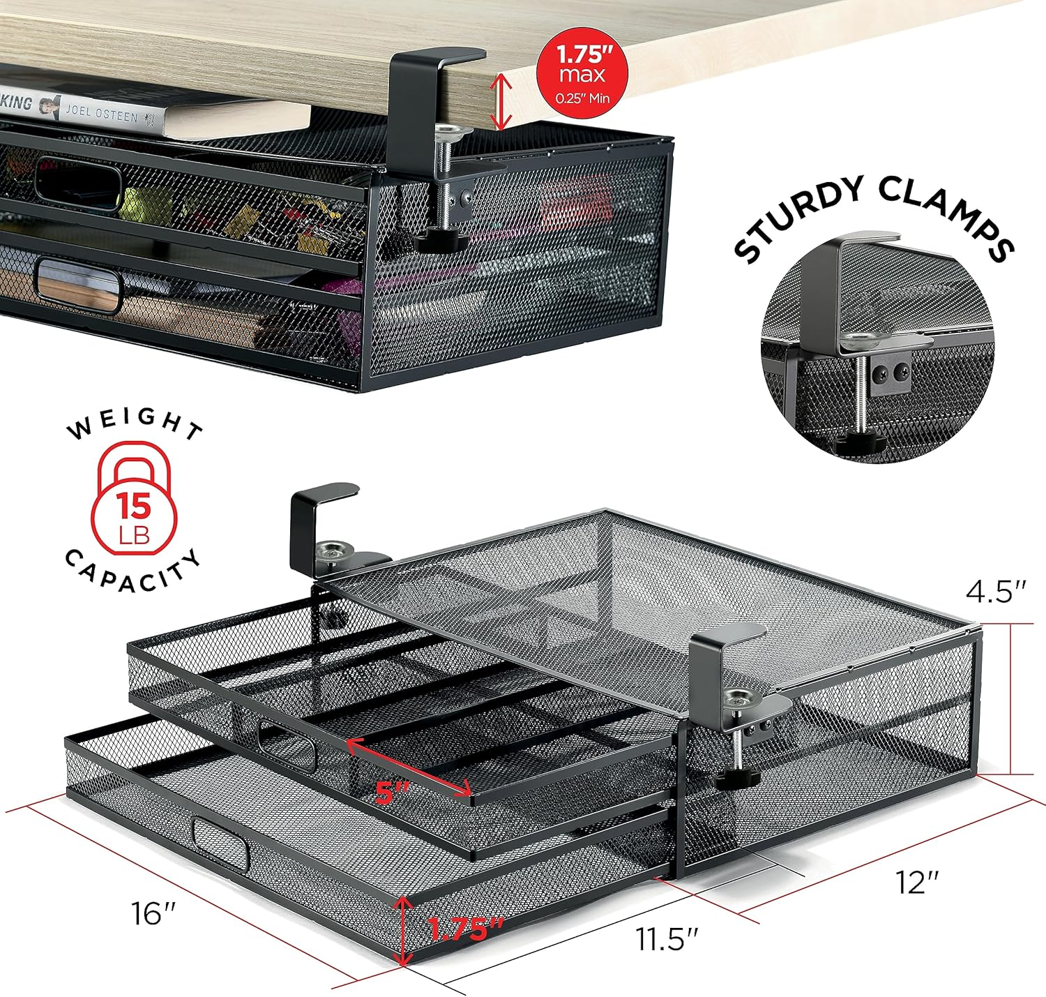 Under Desk Drawer Organizer Clamp-On, Mesh Metal Desk Drawer Attachment, 2 Drawer Slide Out, On Desk Or Under Desk Organizer For Office Supplies & Home Essentials (2 Drawers)