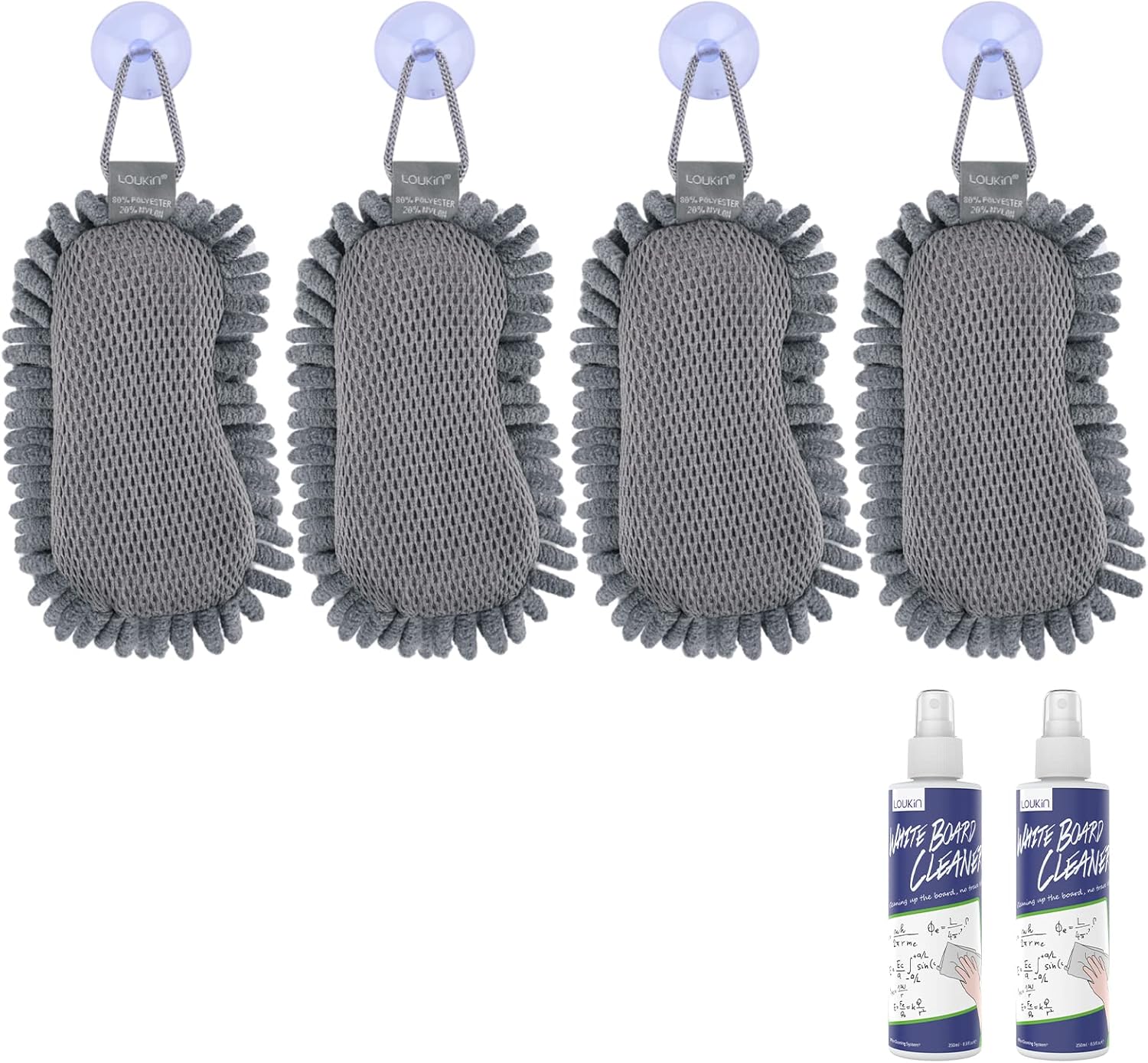 loukin Shag Dry Erase Eraser(4 Pack), Microfiber Whiteboard Eraser, Washable Glass Board Erasers, for Classroom, Home and Office Use (2 Bottles of 3.4 fl oz Whiteboard Cleaner Included)