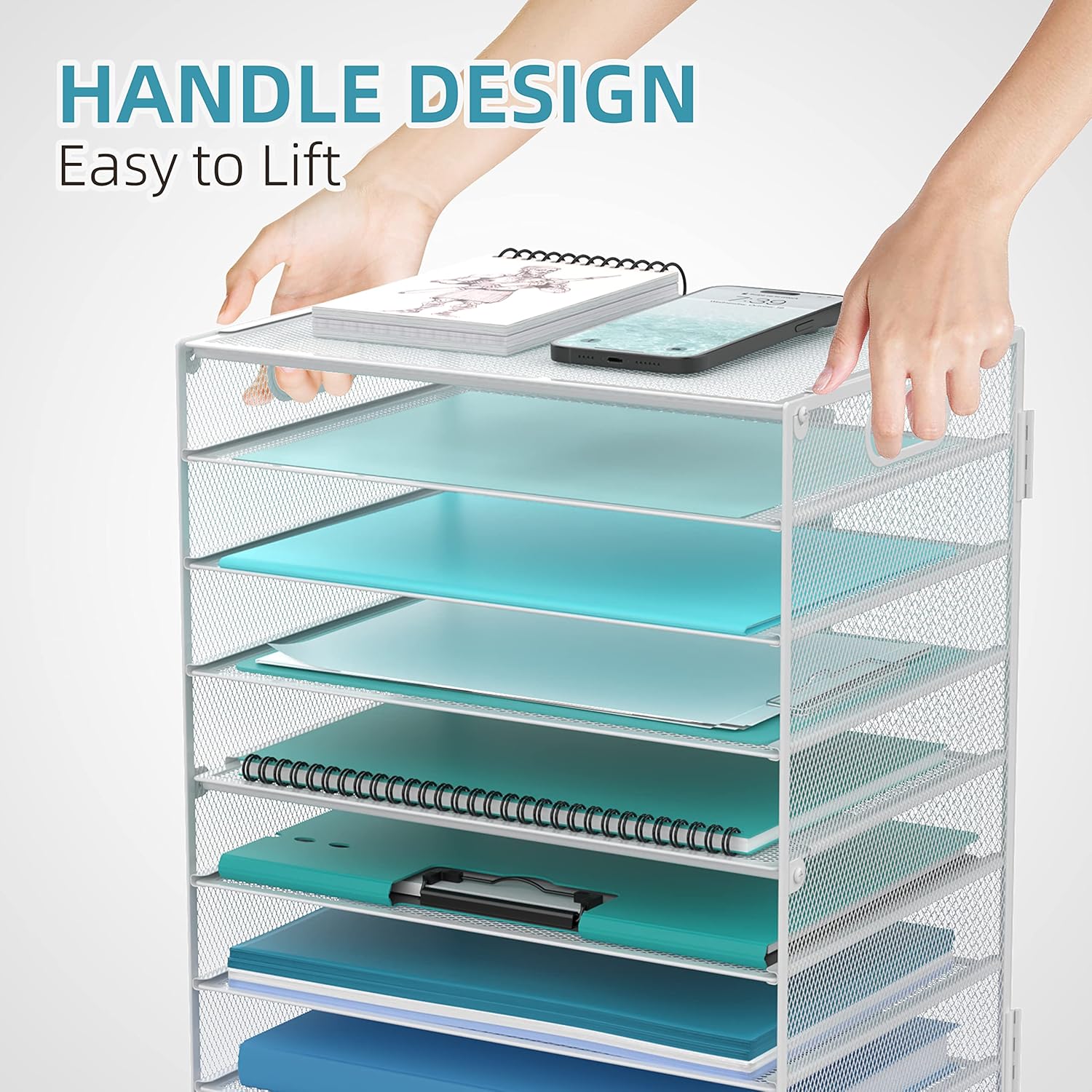 - [Handle Design] The handle design of this 9-tier desk file organizer is very user-friendly. With two portable handles of this paper organizer storage, you can move the office paper tray to any place you want. It's very convenient.