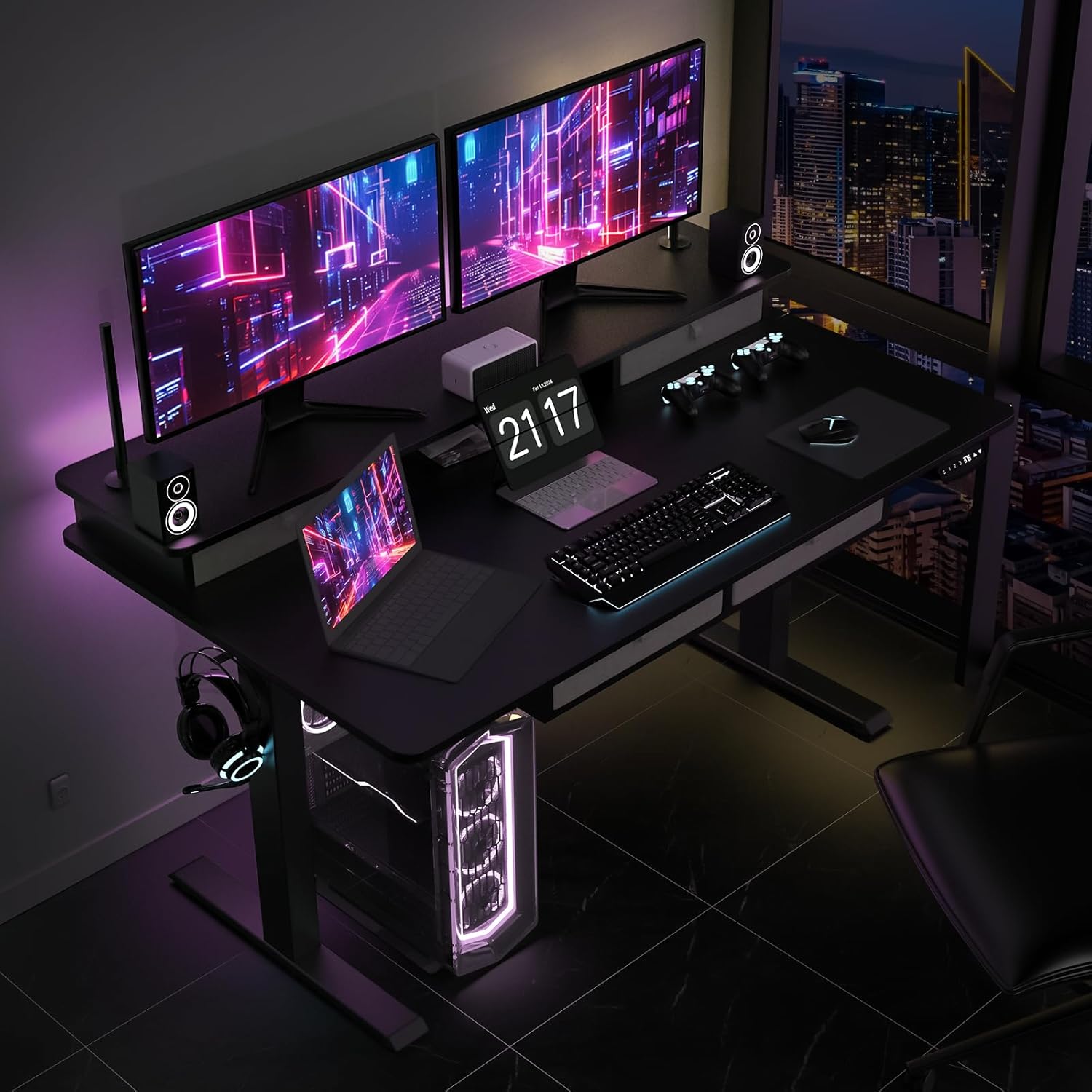 Electric Standing Widened Desk 63 * 30 Inches Adjustable Height with 4 Drawers, Double Storage Shelves Stand Up Desk, Home Office Workstation Sit Stand up Desk (Classical Black)
