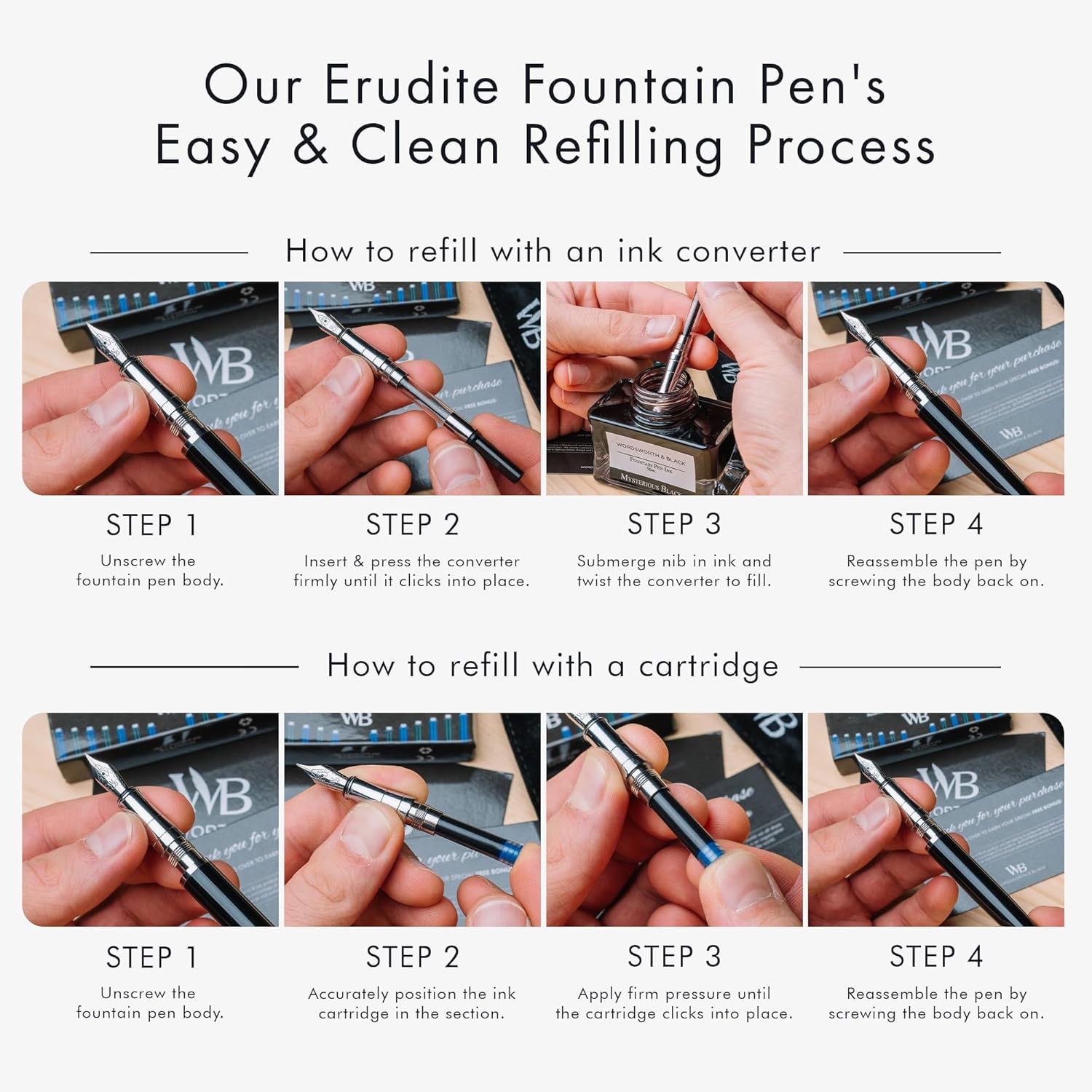 - ✒️Discover The All-inclusive Refillable Fountain Pen Set - Includes luxurious fountain pen, ink converter, 24 Pack Ink Cartridges, and a Gift Pouch - ready to be gifted. Each calligraphy ink and fountain pen ink cartridges comes in a plastic re-closable case and will last you at least 2 weeks of regular use. With every order is a complete instruction booklet for your Wordsworth and Black Pen Set. All the information you'll need to get started using and enjoying your luxurious writing tool!