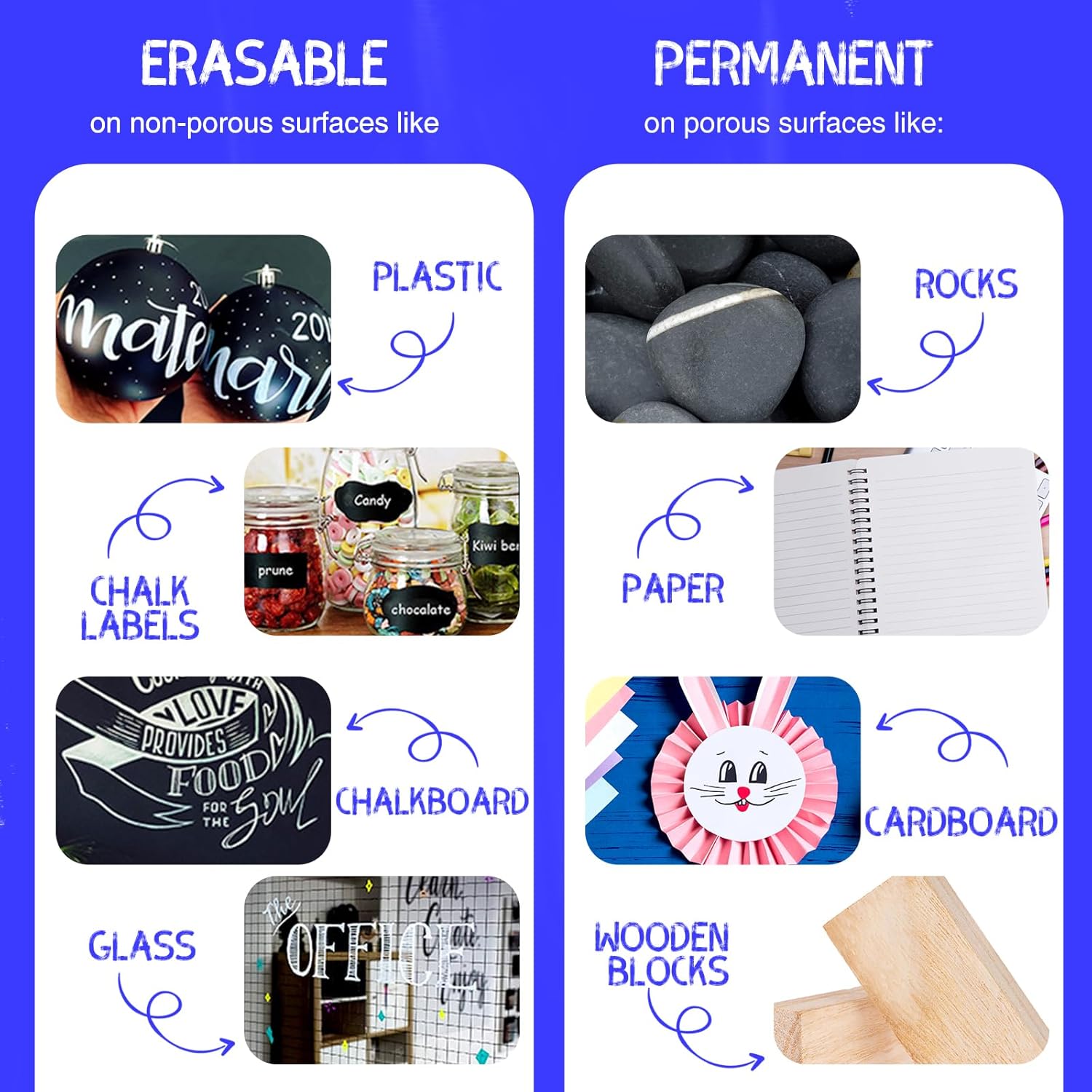 - WET ERASE AND SAFE - Our window paint markers for cars have washable water-based ink, which can be easily erase with no residue by a damp cloth. Each thick chalk board marker pens meets ASTM d-4236 and EN-71 safety standards.