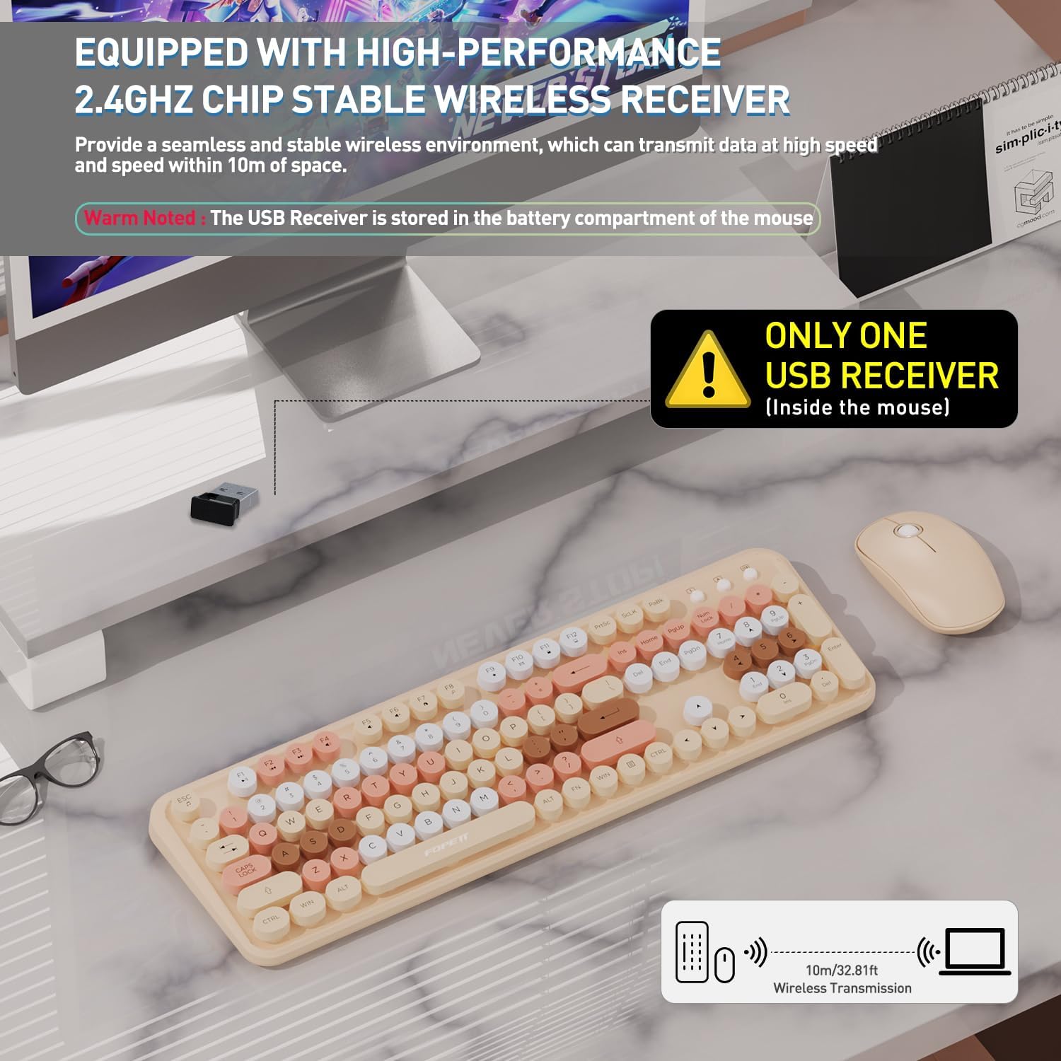 - Cute Wireless Keyboard - Stable 2.4G Wireless Connection : Enjoy a powerful wireless connection with a range of up to 10 meters (393.7 inches) for the keyboard and mouse combo. They utilize a shared Nano receiver, conveniently stored at the bottom of the mouse, Plug and Play.eliminating the need for additional software installation.keeping your desk clean.Keyboard size 17.5 x 5.5 x 1.3 inch With 105 Keys. Mouse size is 4.1 x 2.5 x 1.0 inch. Keyboard net weight: 1.57LB,Mouse net weight: 0.15LB.