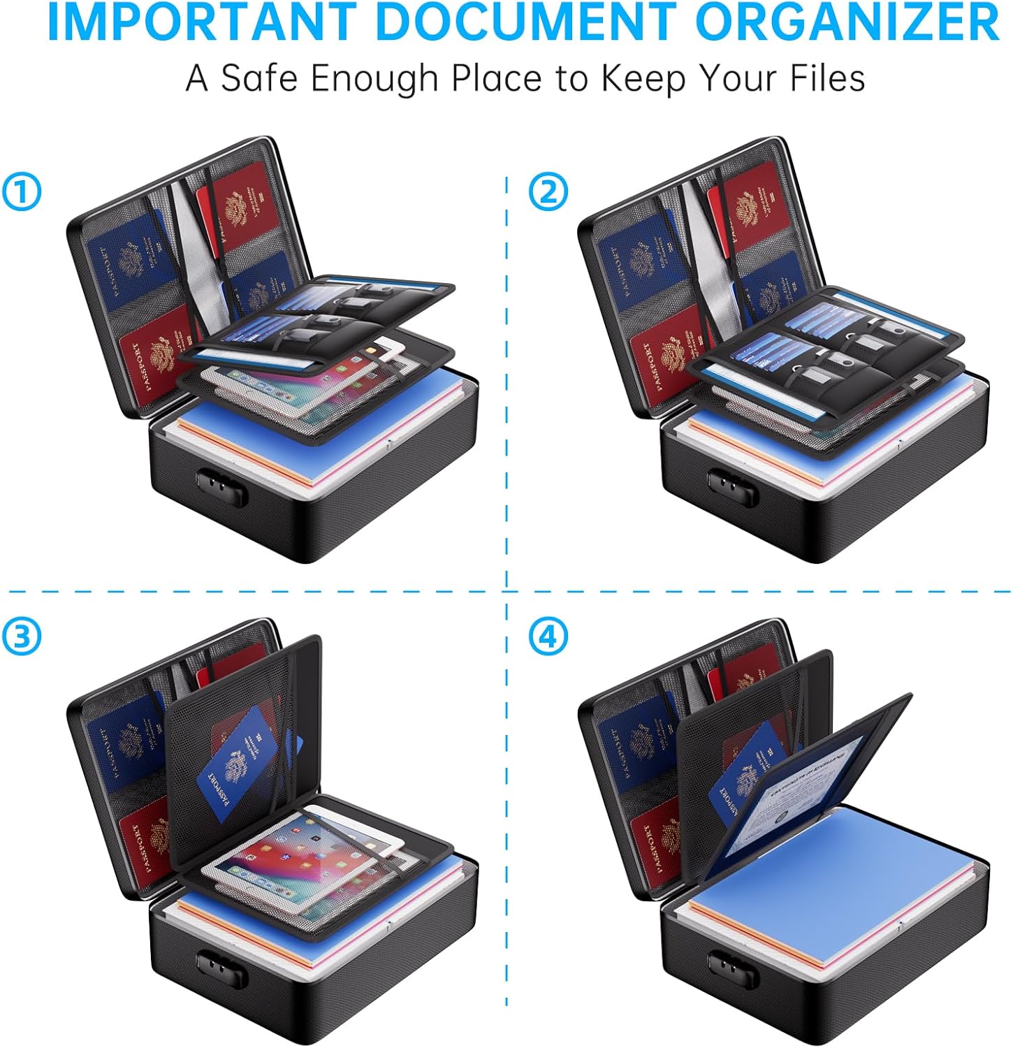 - Combination Lock Protection: Compared with other bags,our 5200°F fireproof document organizer bag can lock files and items inside the bag for safety. High-quality password lock provides maximum security for your valuables such as contracts, cards, certificates, conference materials, passports, etc. The package includes an instruction manual for lock(No keys required).Fireproof bag for files is sealed with professional waterproof zippers that can withstand high speed spray of fire hose.