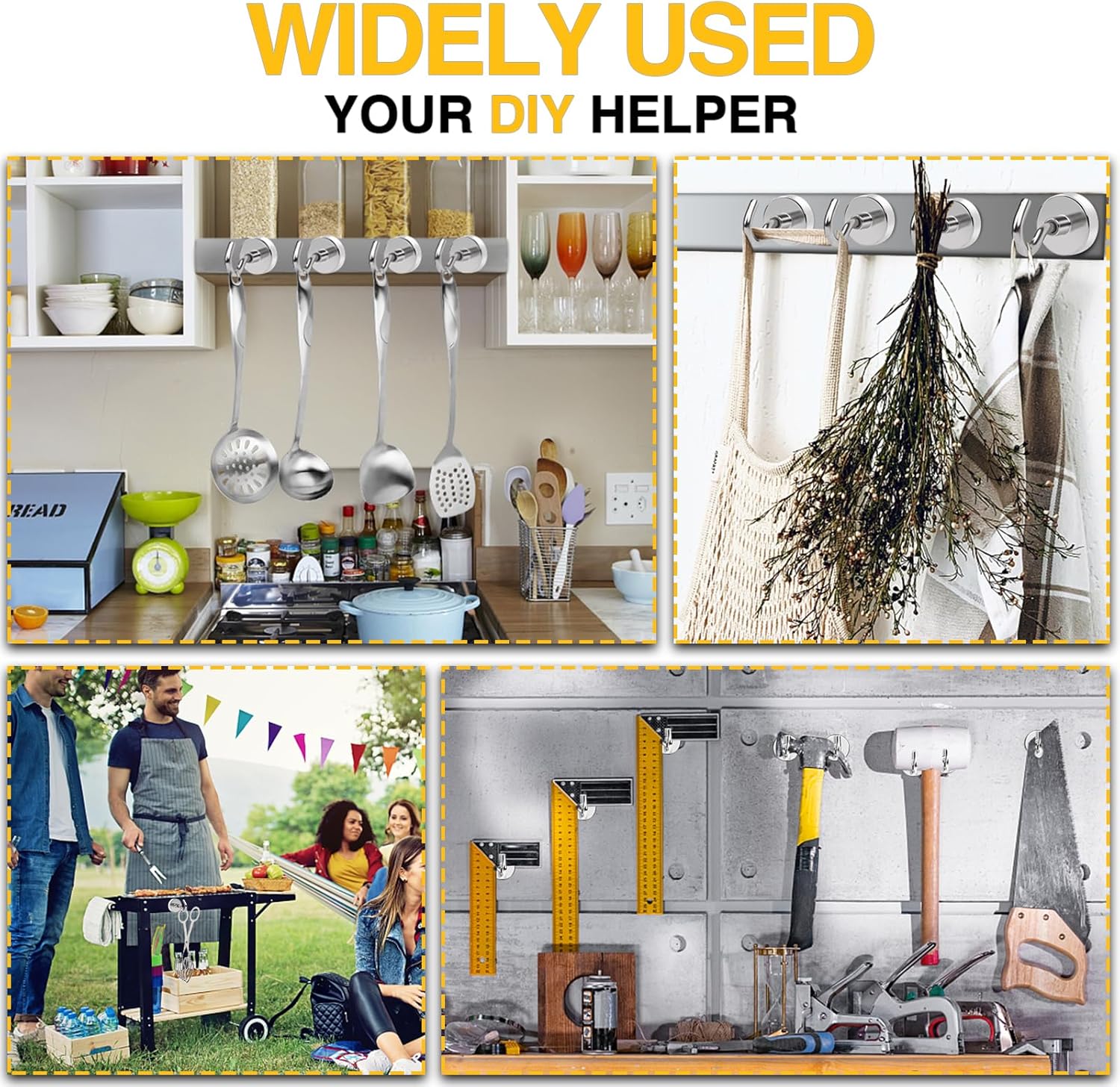 - 【Versatile Use】Super strong neodymium 118 lb magnets with hooks are perfect for hanging grill tools, decorative lights and tool accessories, also be widely used in cruise, fridge, kitchen, workplace office, garage, indoor, outdoor and anywhere there is iron or steel. No drilling holes, No sticky residue, No bolt or screws; Easy to install or remove and reusable.