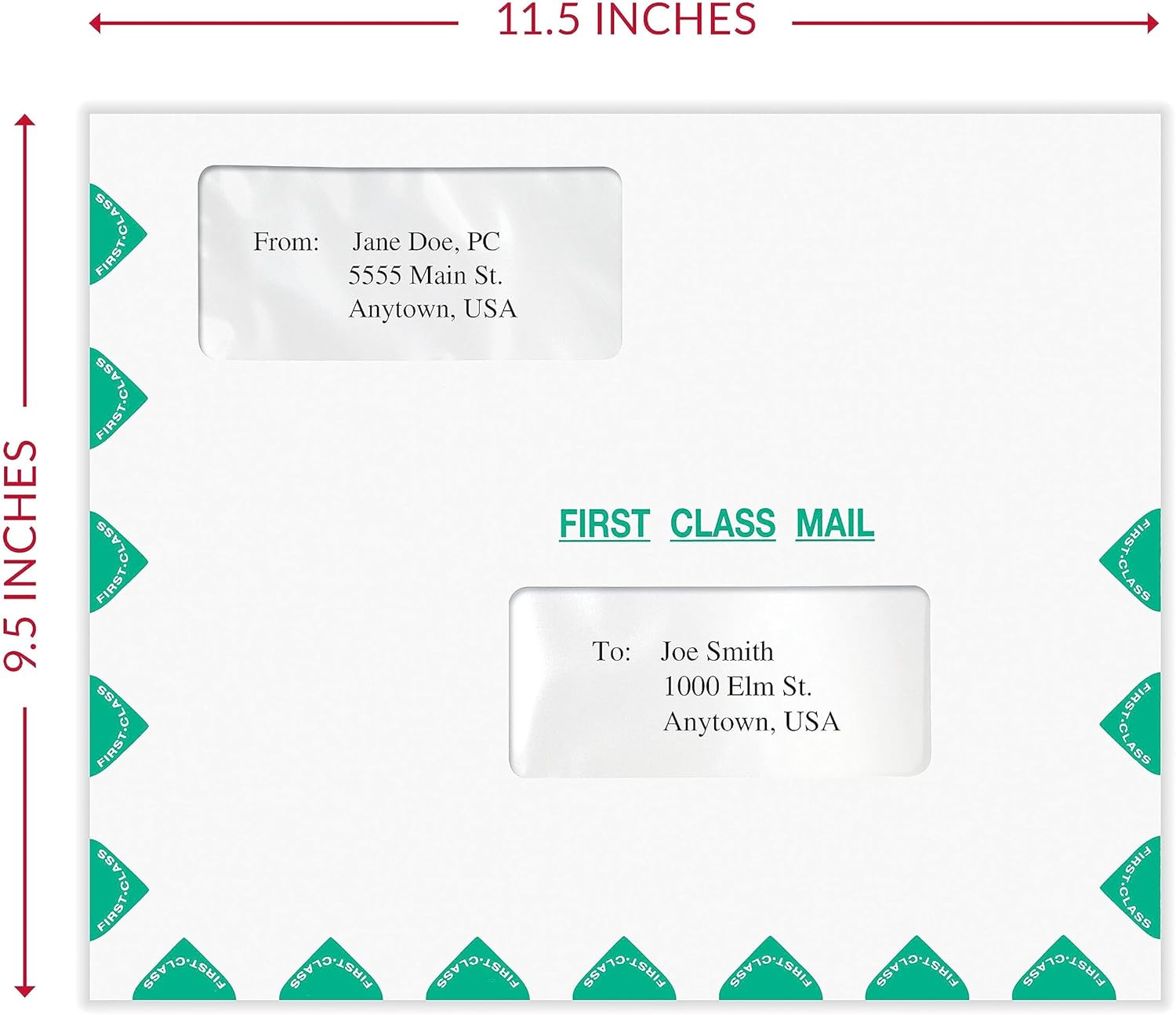 First Class Double Window Envelope | Tax Mailer, Landscape, White/Green, Moisture-Seal, 9-1/2" x 11-1/2", Pack of 50