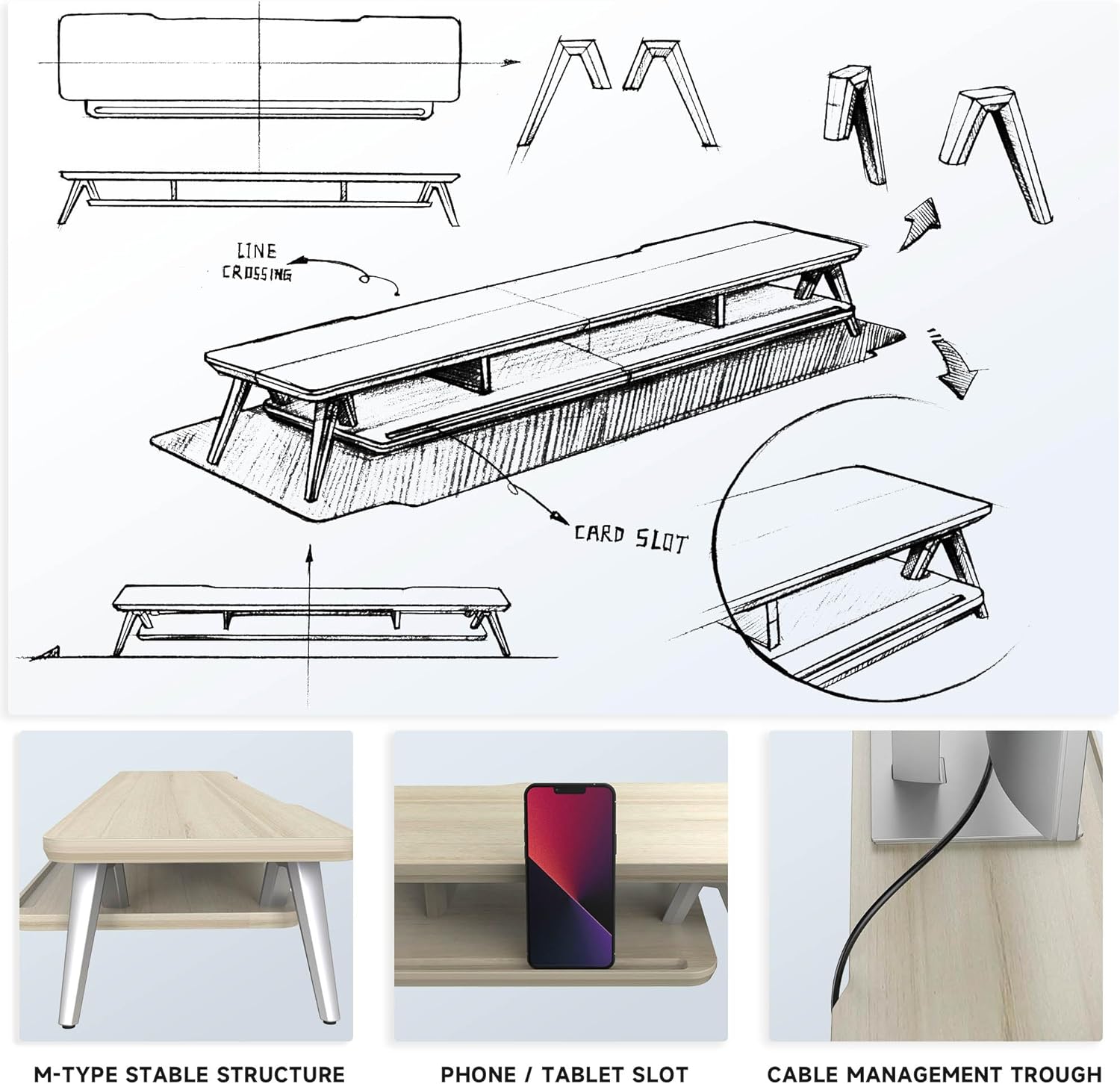 - 【2 TIER DESKTOP ORGANIZER】At longest 42.5inch wide,longer size with more space. This laptop riser is big enough to support two monitors. It has 1 universal device holder slot and 3 high capacity compartments. You can easily store your office accessories & supplies under your monitor stand to keep your desktop tidy. Our monitor stand rise comes with cable management slots that can make your cord stay organized.