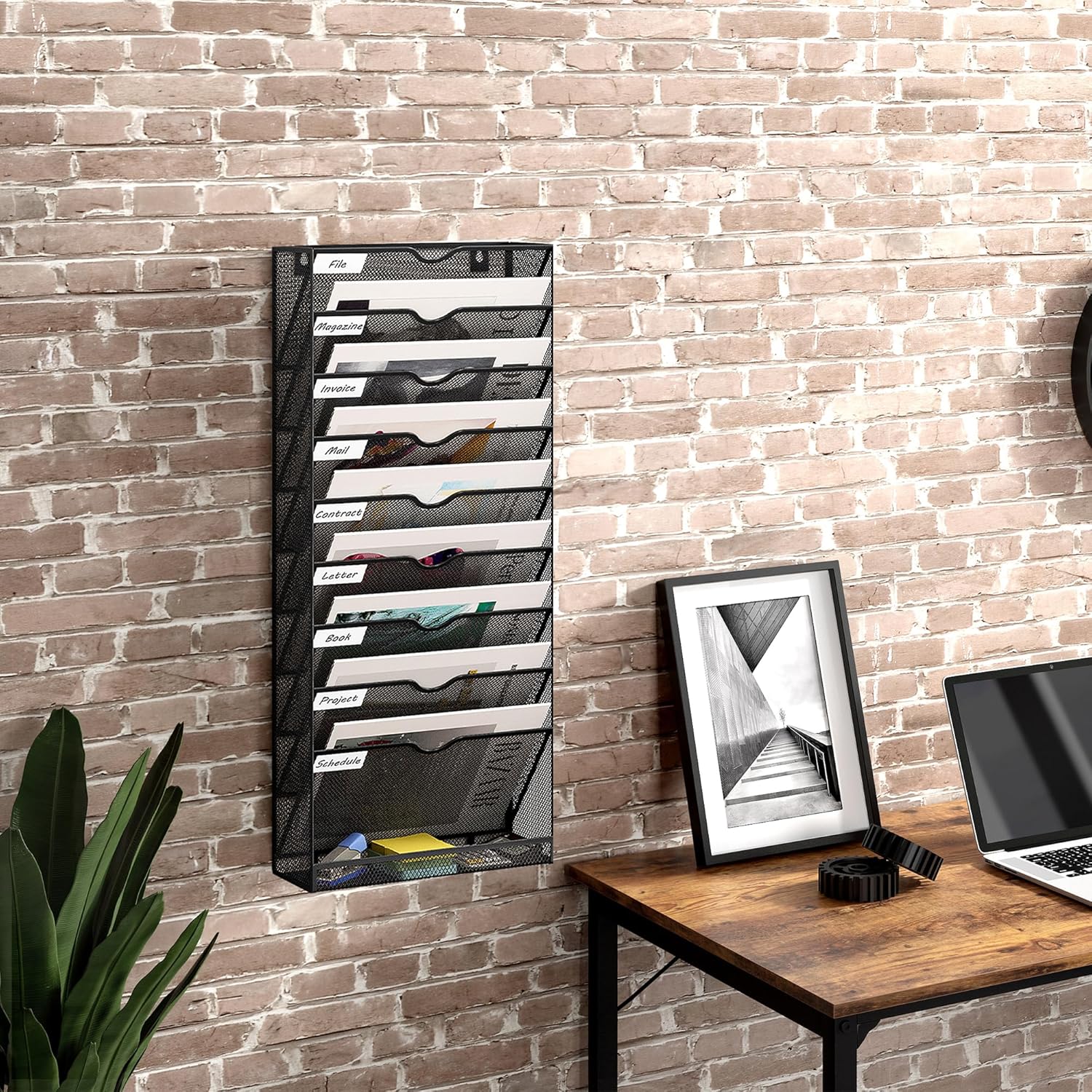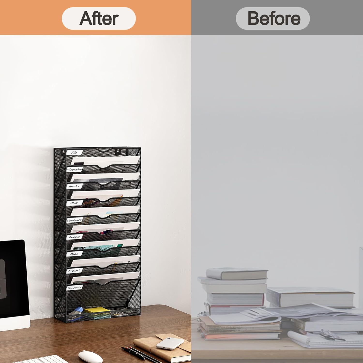 - Durable: The Mail organizer wall mounted is made of durable metal with a coating that extends the life of the wall mount. The metal mesh construction reduces weight while keeping air circulating through the wall paper organizer, so you don't have to worry about mold and mildew on your documents or papers