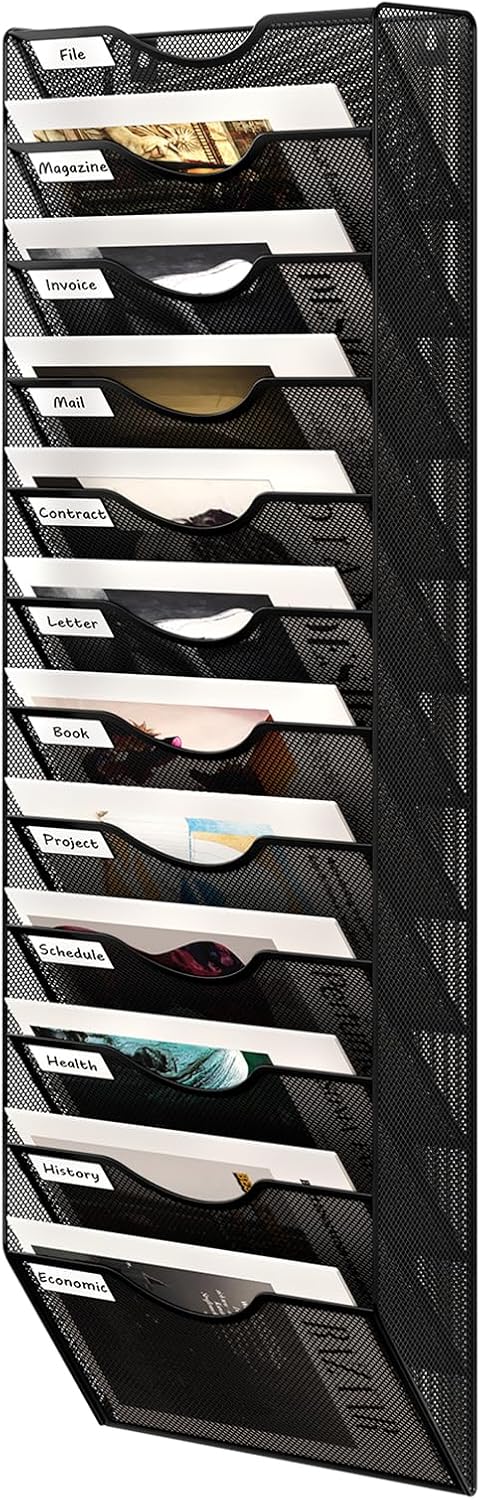 - Durable: The Mail organizer wall mounted is made of durable metal with a coating that extends the life of the wall mount. The metal mesh construction reduces weight while keeping air circulating through the wall paper organizer, so you don't have to worry about mold and mildew on your documents or papers