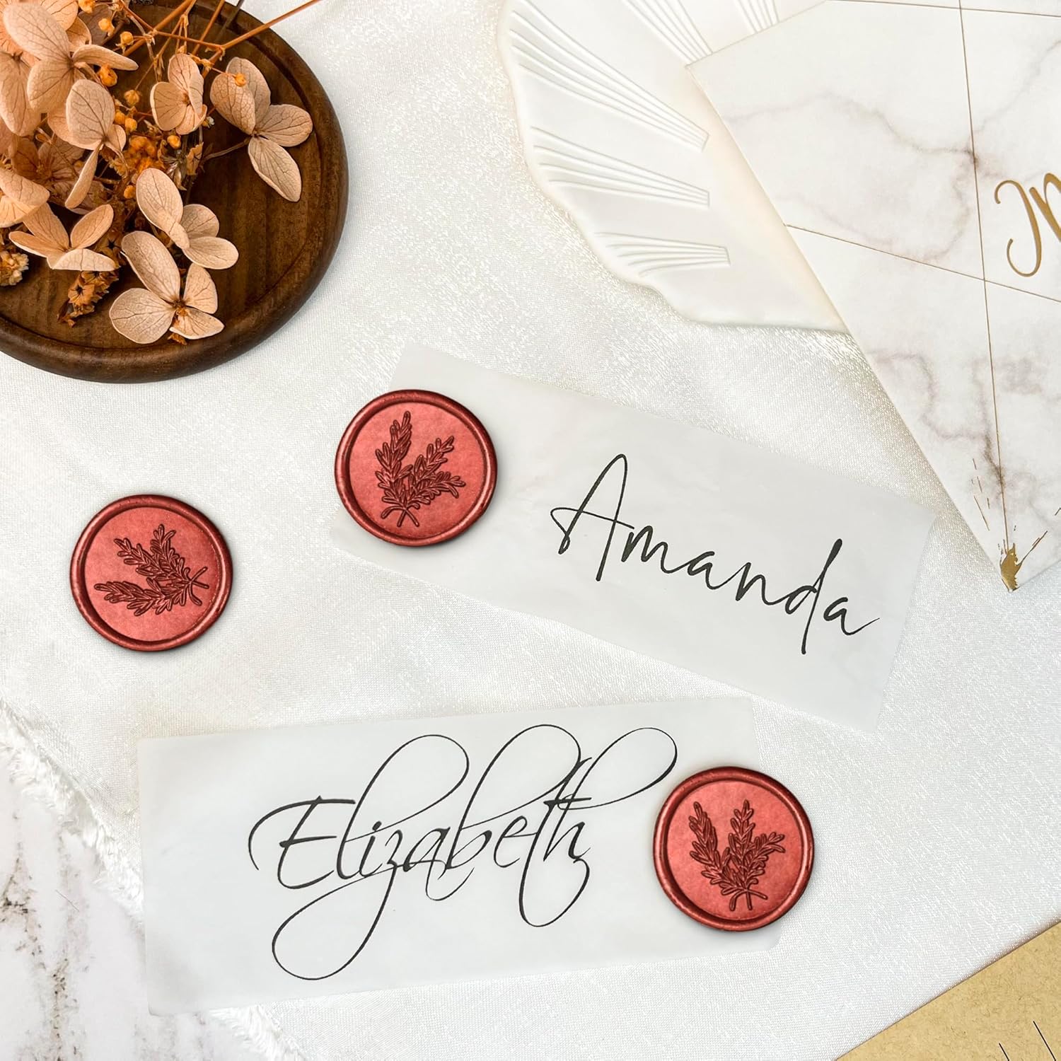 - PACKAGE CONTENT:You will get 100pcs Rosemary Style , wax seal sticker made by pure hand, the wax seal sticker is 1.18 inches/30 mm in diameter, each Rosemary wax seal has almost the same size of adhesive on the back of the sticker, perfect for mailing, you don't need to worry about the strength of the adhesive at all.