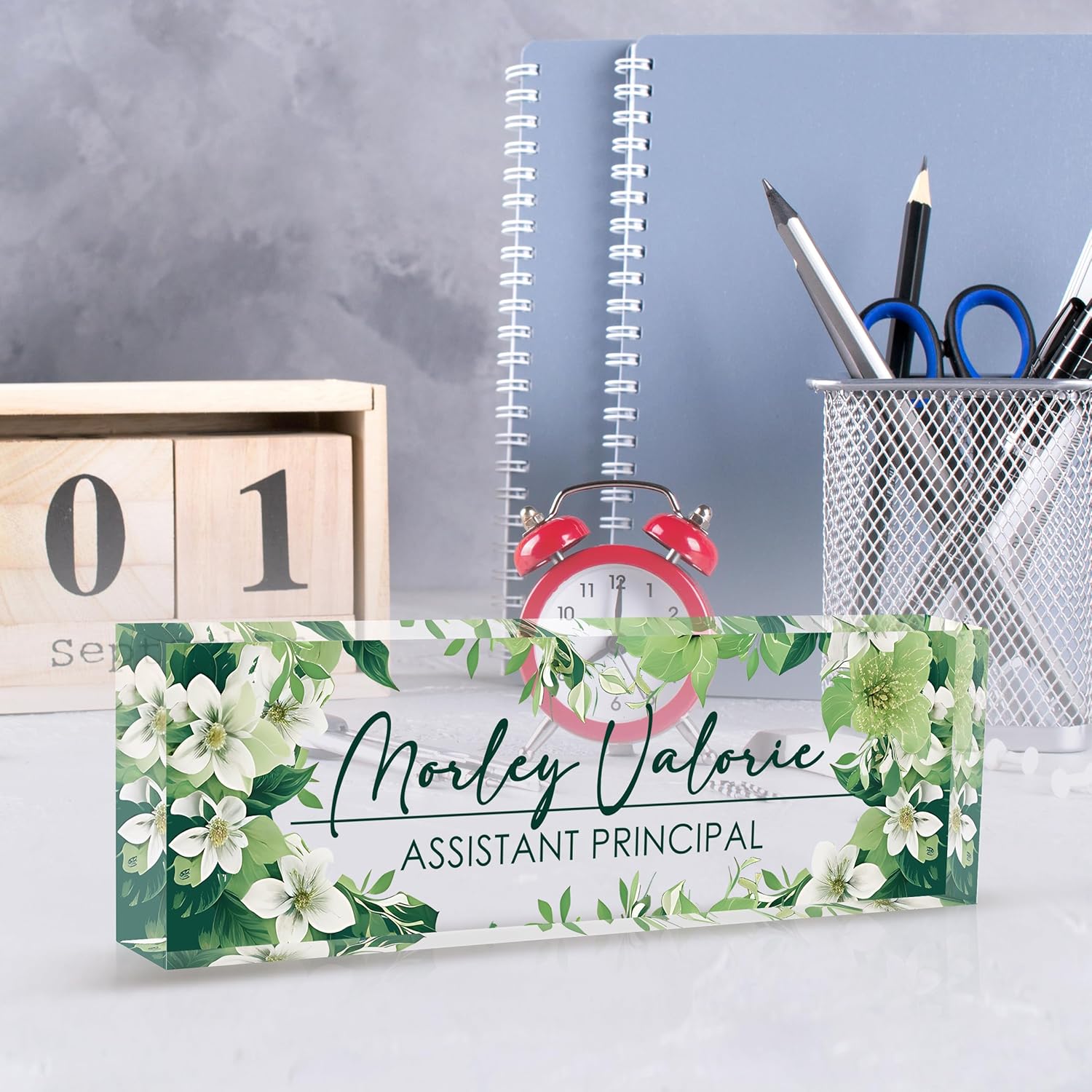 Custom Name Plate for Desk | Personalized Desk Name Plate | Personalized Boss Employee Appreciation Gifts | Acrylic Name Plate Office Desk Accessories (B-Green Flower)