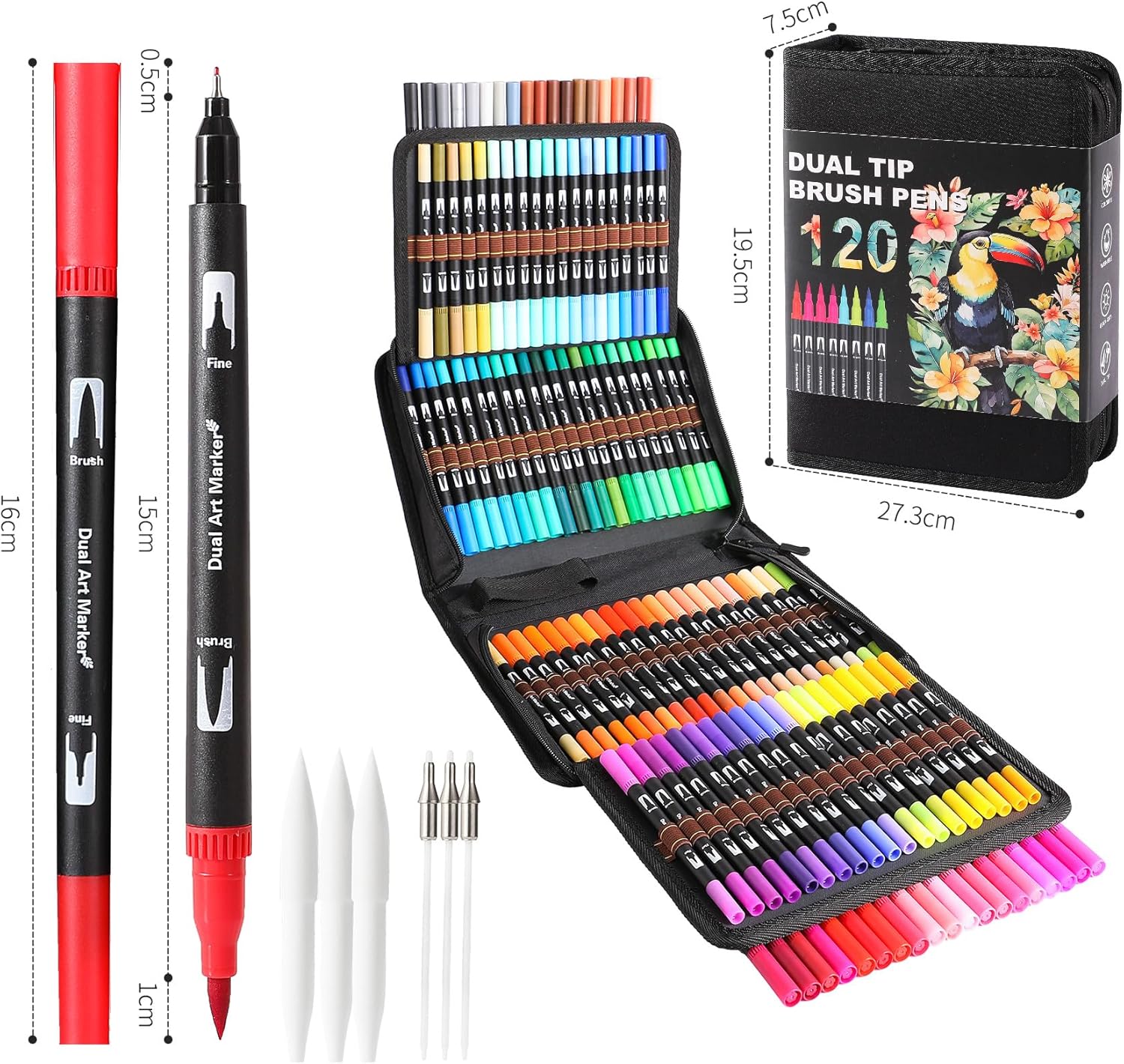 Double Brush Marker Pens, 120 Colors Art Markers Set with Fine Tip and Brush Tip for Kids Adult Coloring Book Hand Lettering Calligraphy Drawing Art Supplies Kit