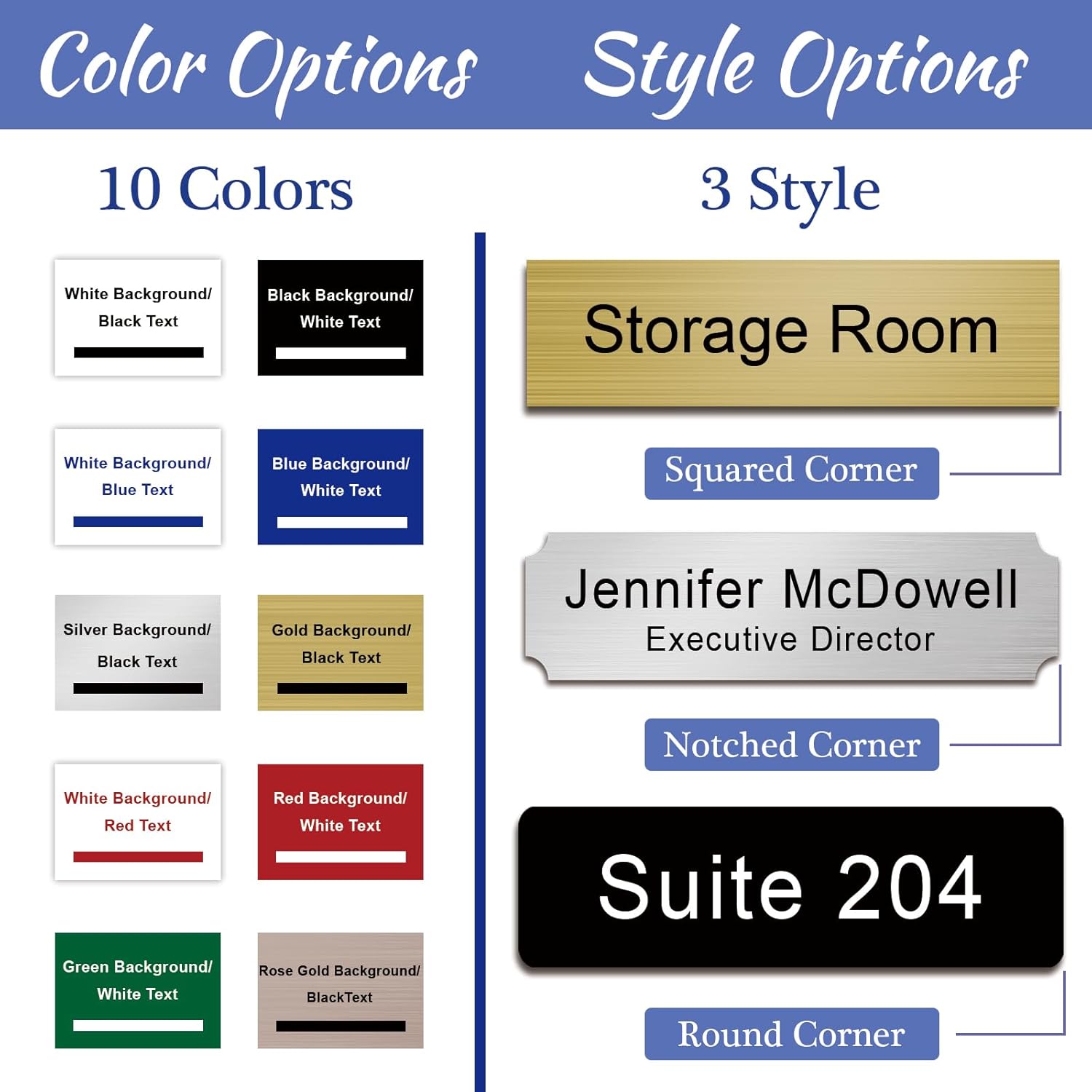 - Unique Design: The custom office door name plate design in 3 styles (Notched Corner, Round Corners, Squared Corner). 10 colors available. Size is 2"H x 8"L.